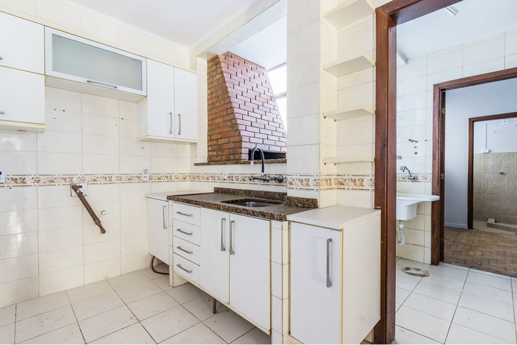 A planta generosa oferece 3 dormitórios, sendo 1 suíte, dependência completa, banheiro social, cozinha com churrasqueira e um living amplo para dois ambientes.