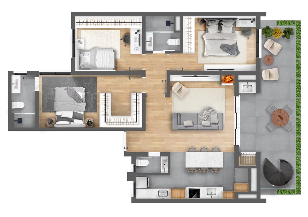 Unidade 504: 3 Dormitórios com Rooftop; 194,5 m² privativos; Terraço de 79,49 m² + Varanda com Churrasqueira; Suíte com mais de 18 m²; 2 vagas cobertas lado a lado.