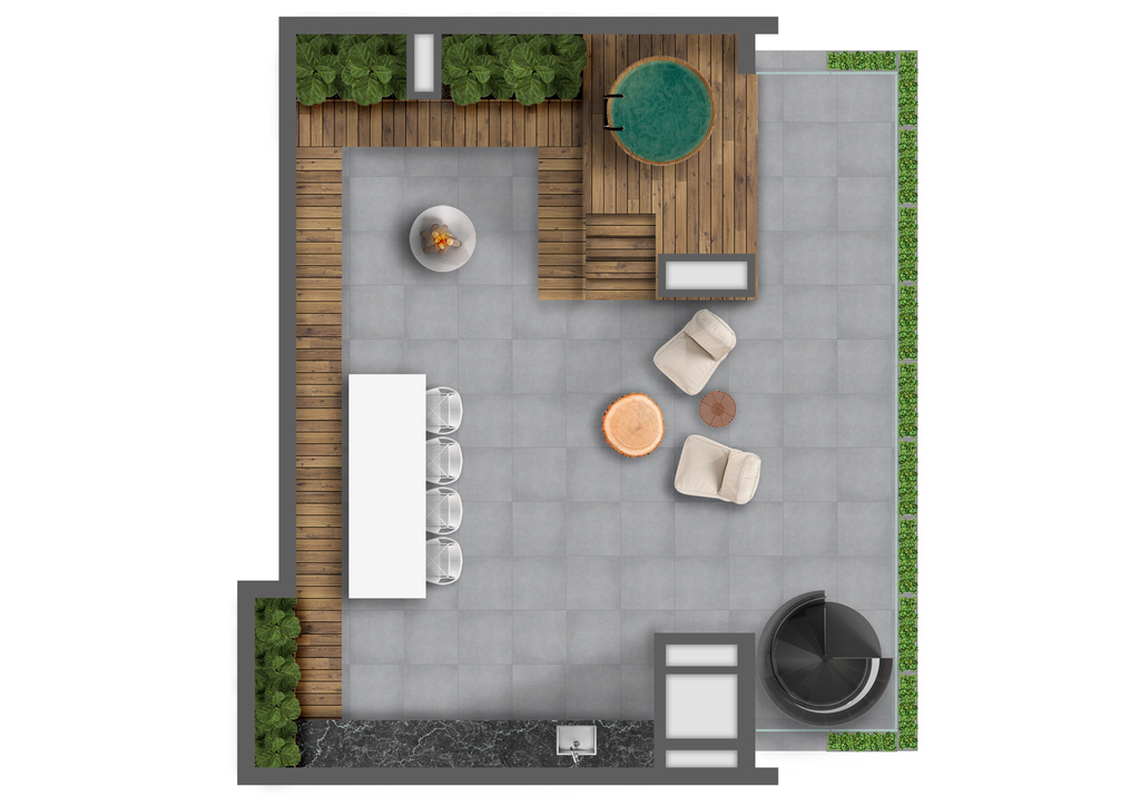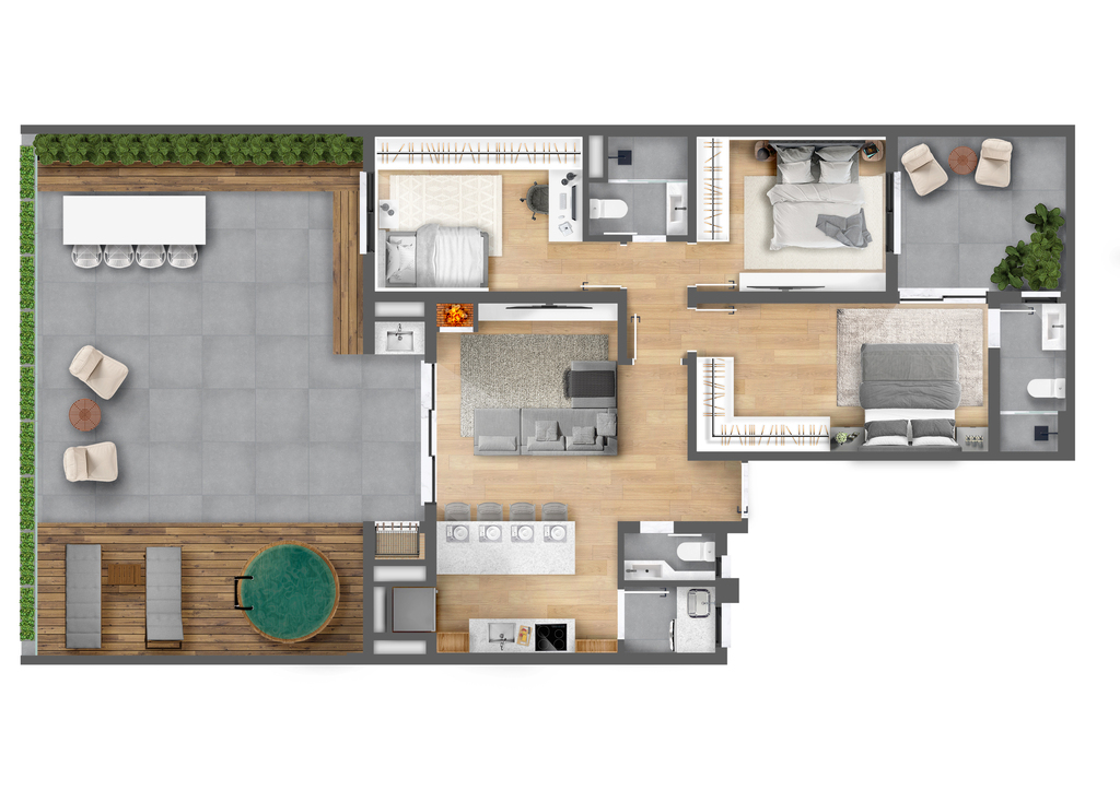 Unidade 504: 3 Dormitórios com Rooftop; 194,5 m² privativos; Terraço de 79,49 m² + Varanda com Churrasqueira; Suíte com mais de 18 m²; 2 vagas cobertas lado a lado.