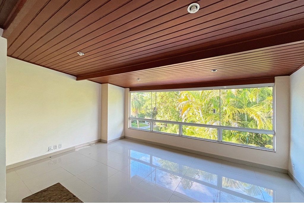 A vista deslumbrante para uma área verde é o toque final, trazendo um aconchego indescritível para o sótão.