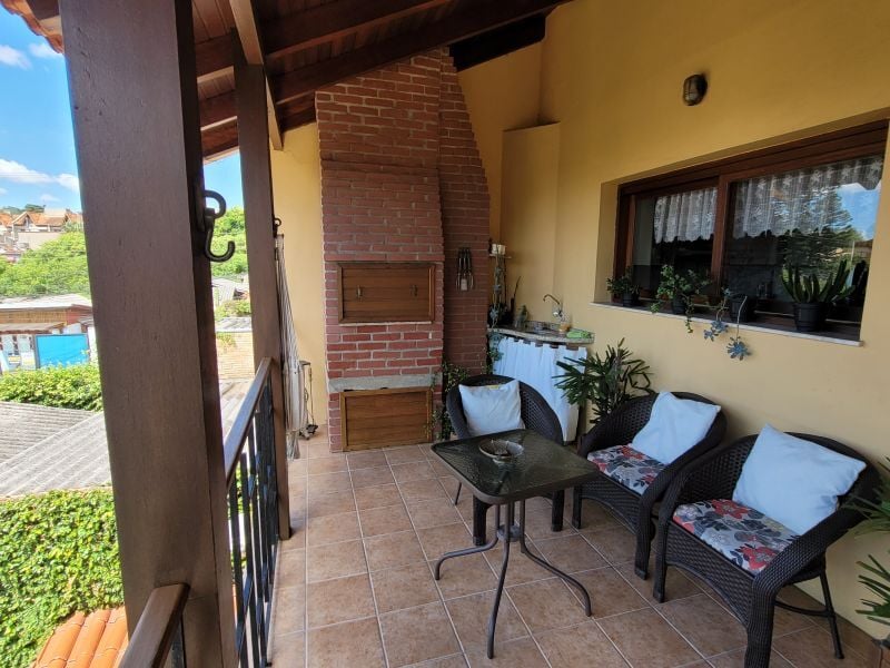 Piso superior com 3 dormitórios, hall, sacada e vista, espaço de churrasco rústico, com mesas e cadeiras, que integram com o amplo pátio, lavanderia, depósito, adega, oficina, garagem ampla fechada, acessos independentes.
