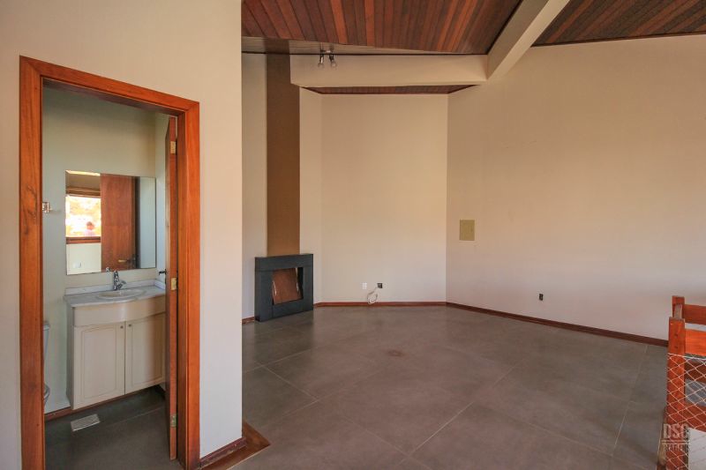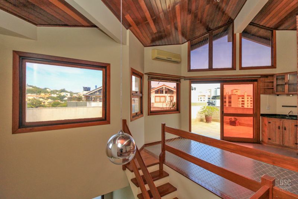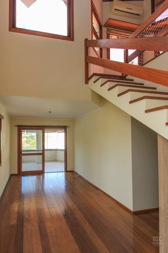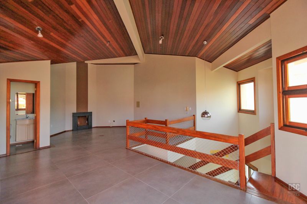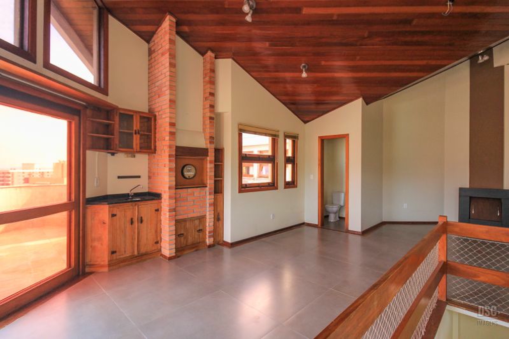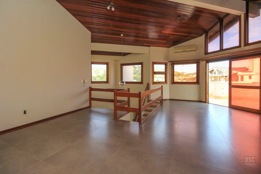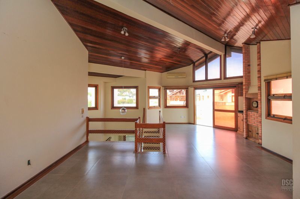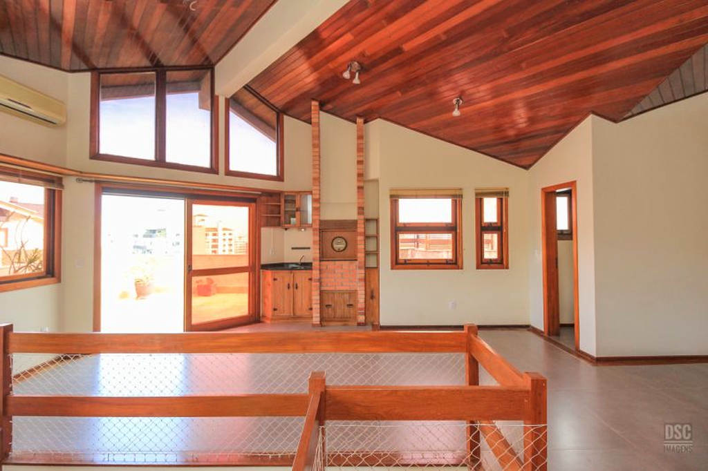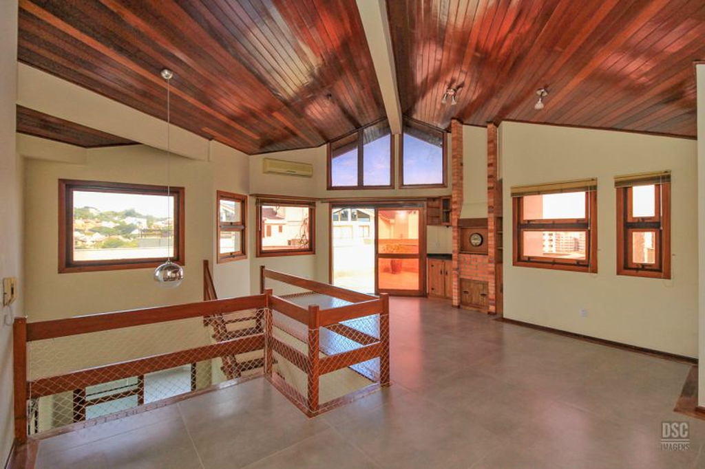 Parte superior, escada reta em madeira, amplo ambiente de estar com lareira e churrasqueira, terraço panorâmico, com vista do Guaíba e muito sol.
