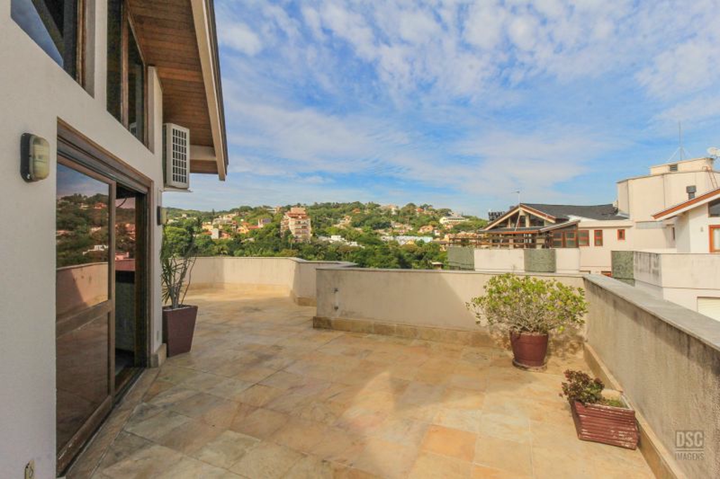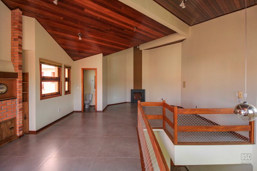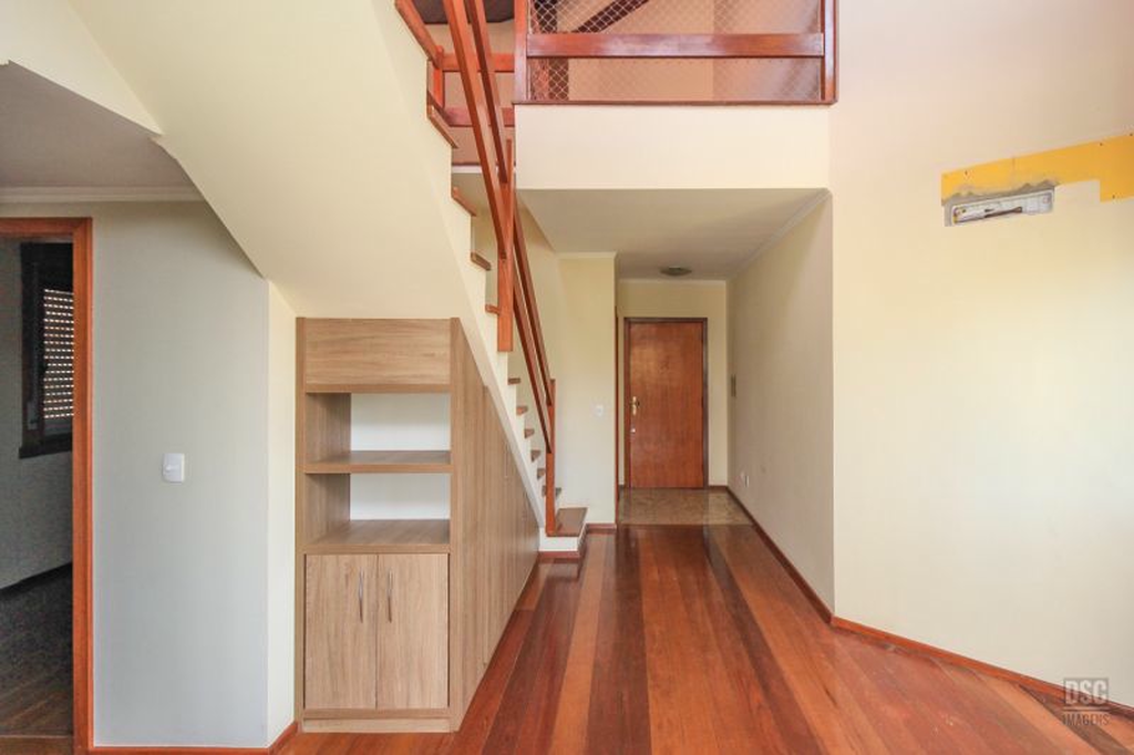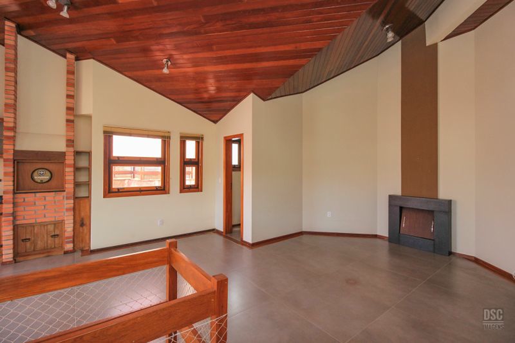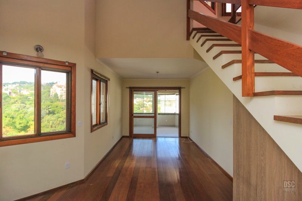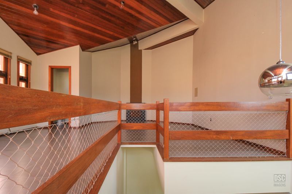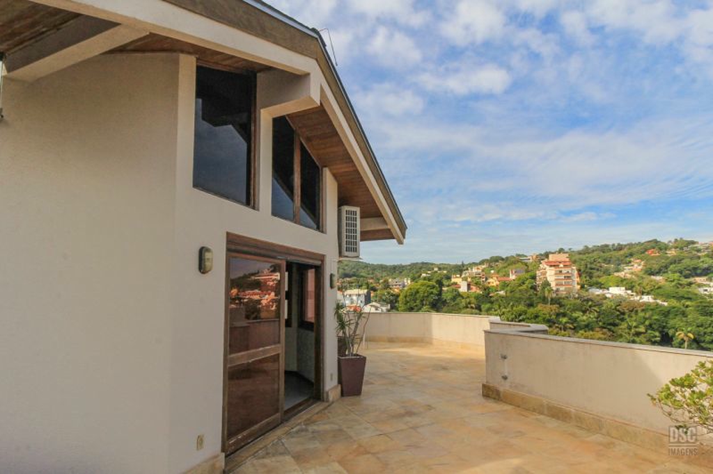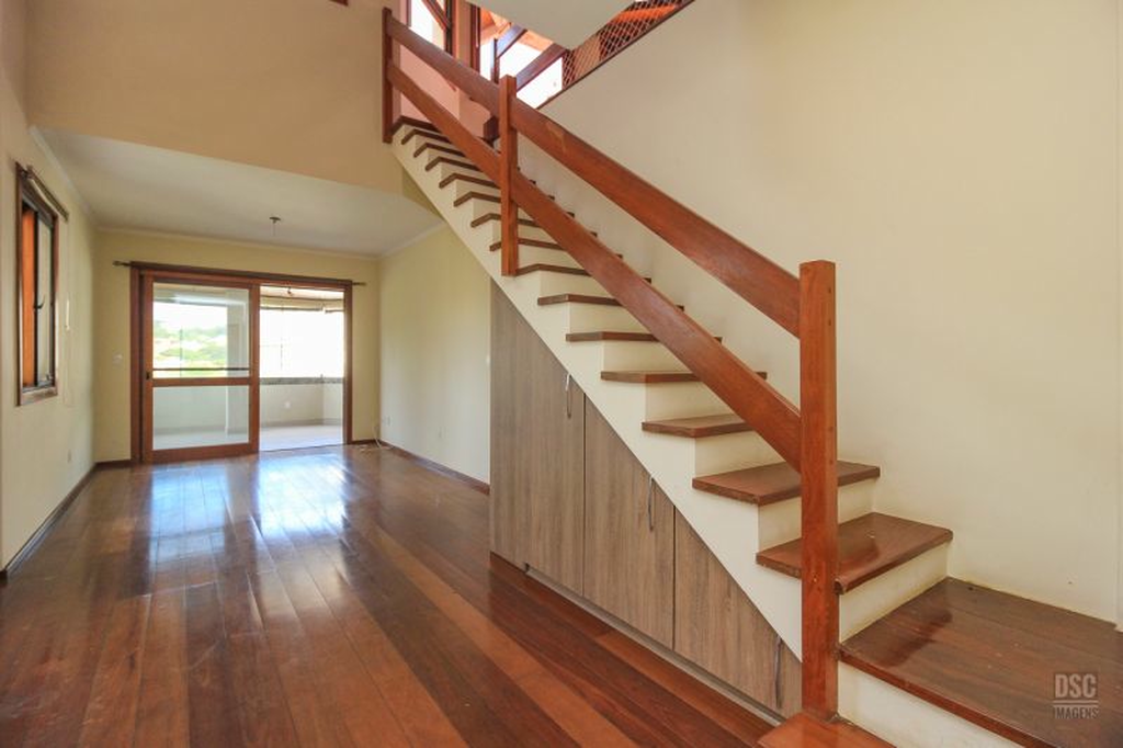 Parte superior, escada reta em madeira, amplo ambiente de estar com lareira e churrasqueira, terraço panorâmico, com vista do Guaíba e muito sol.