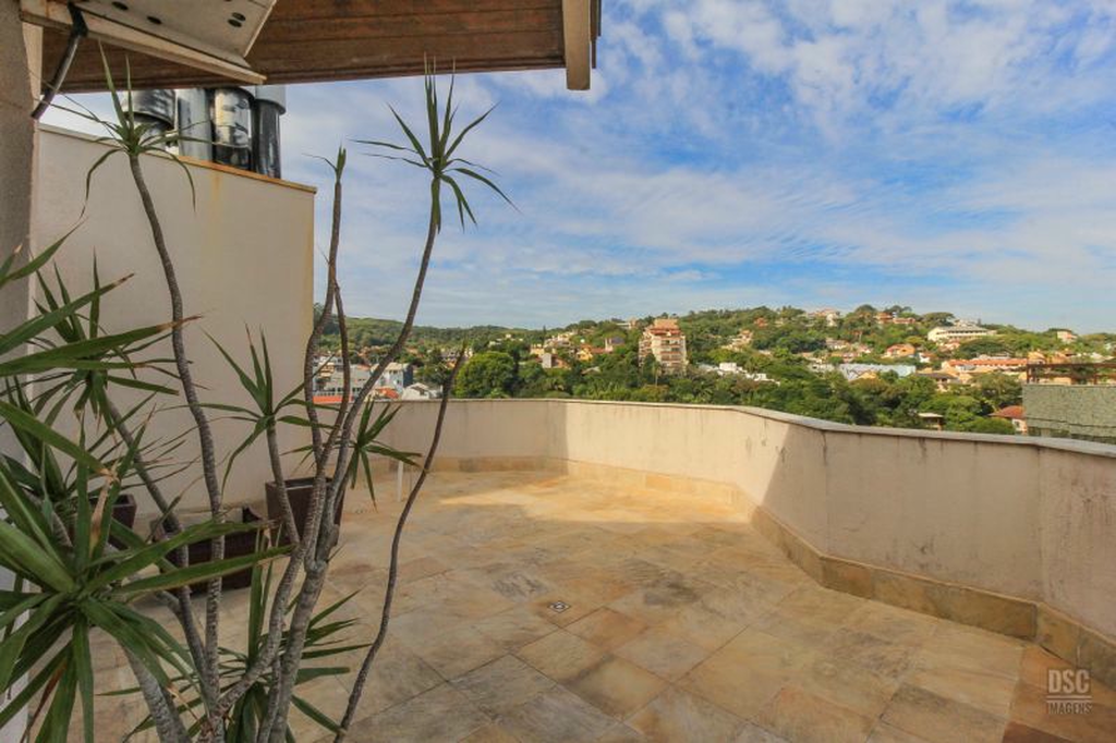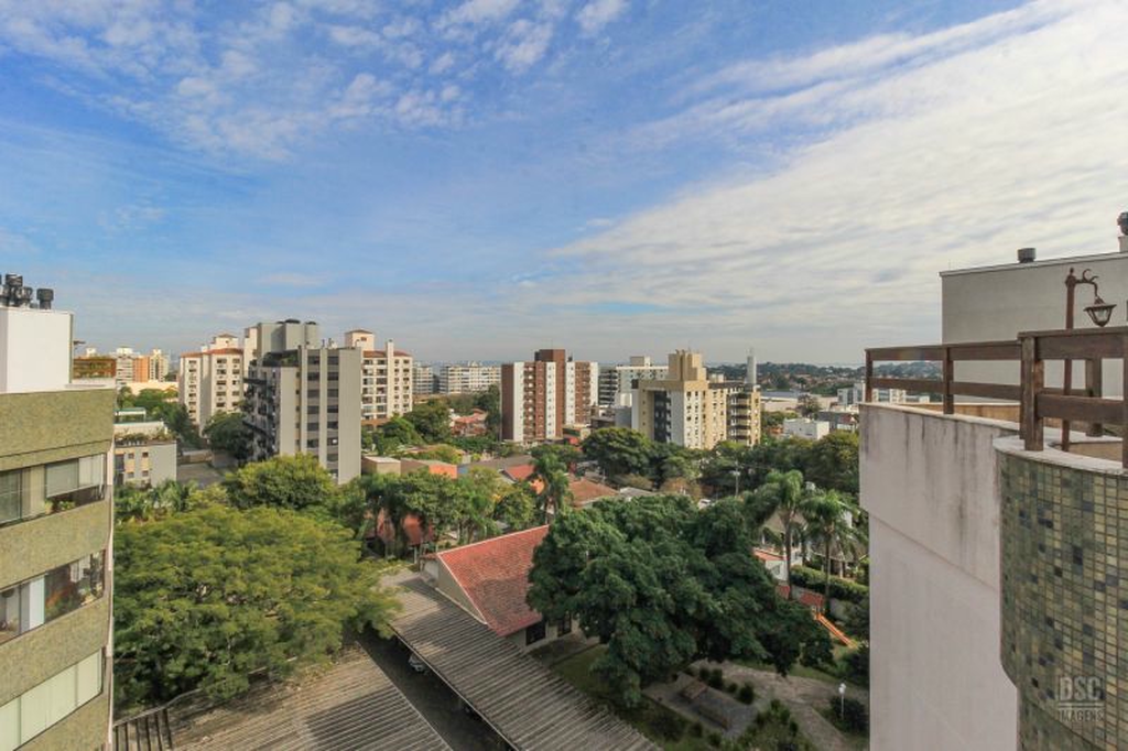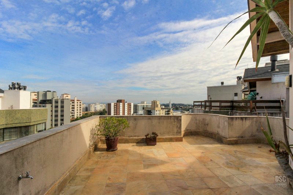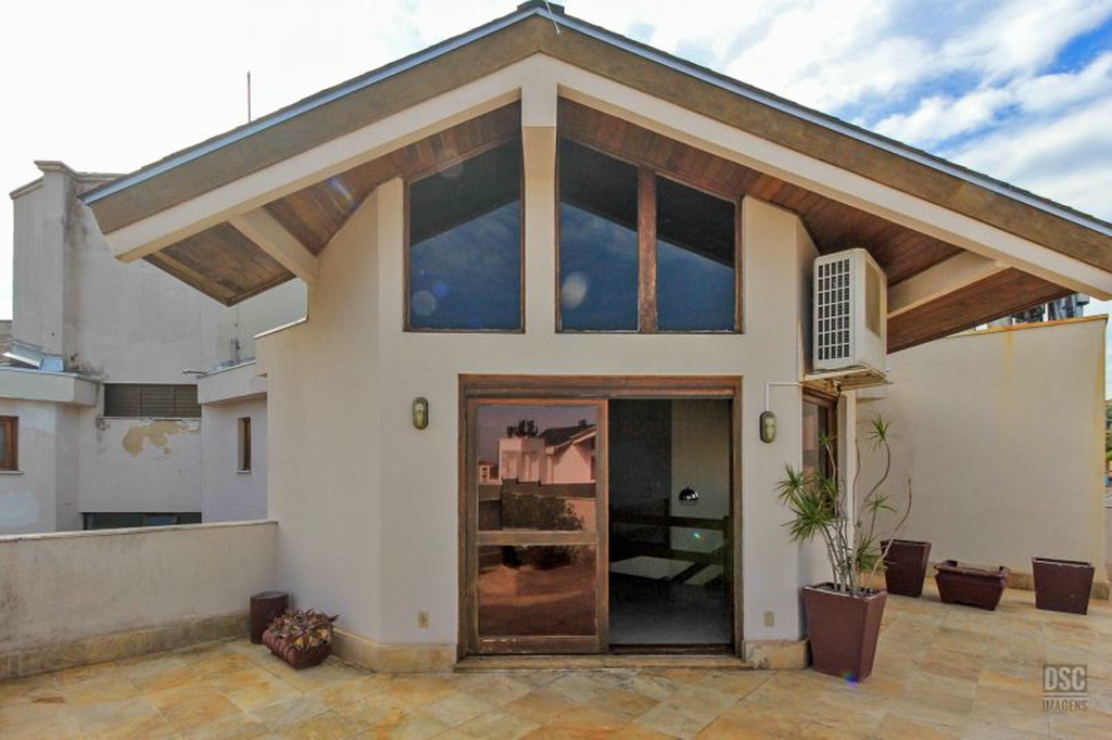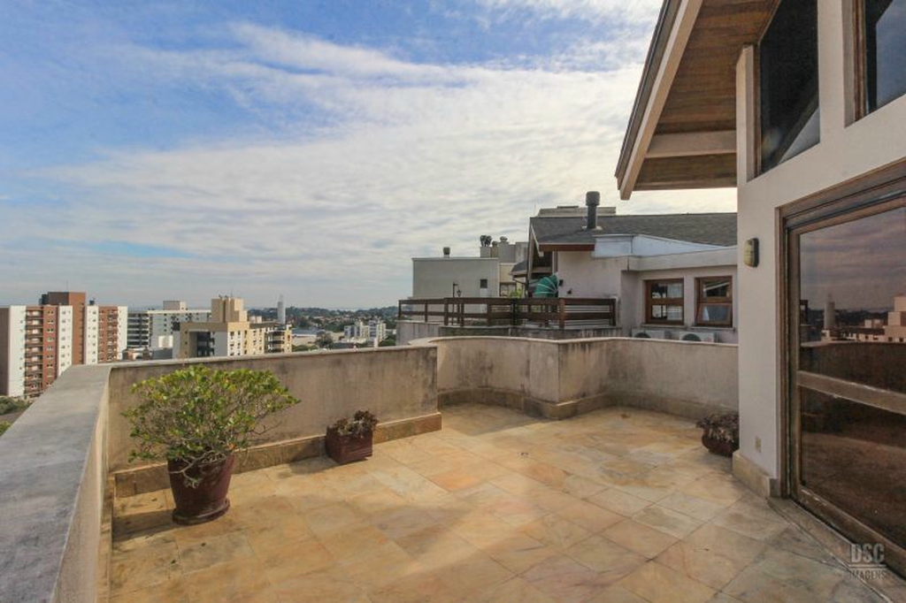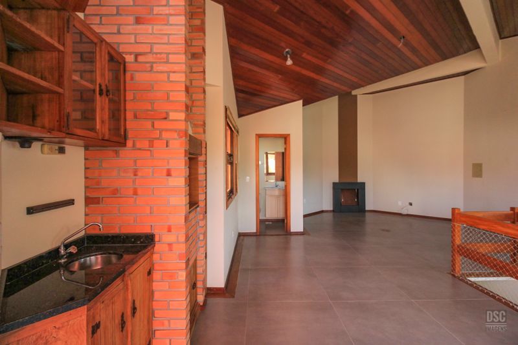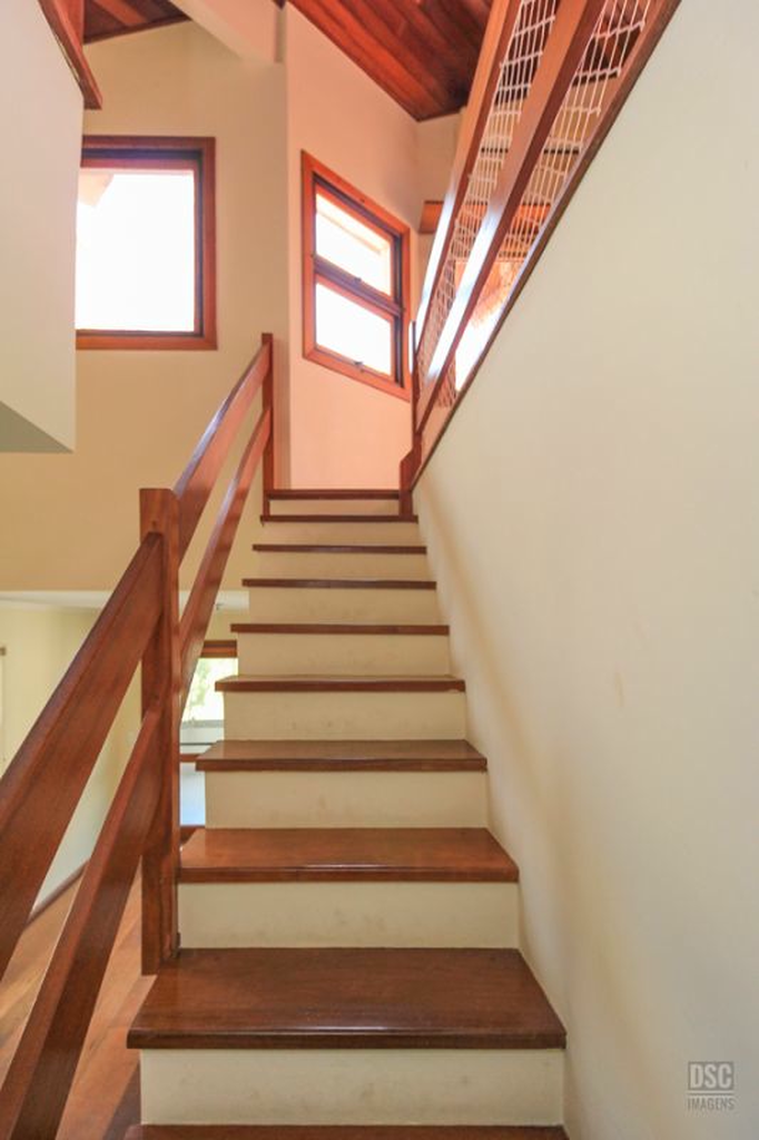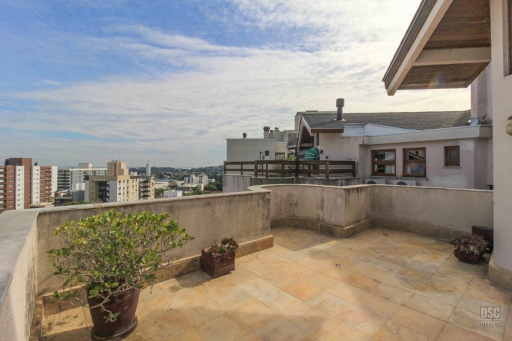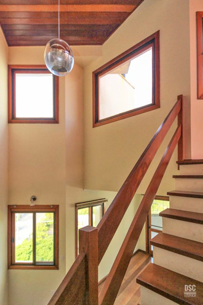 Parte superior, escada reta em madeira, amplo ambiente de estar com lareira e churrasqueira, terraço panorâmico, com vista do Guaíba e muito sol.