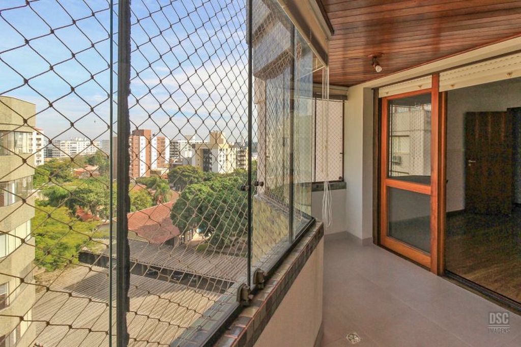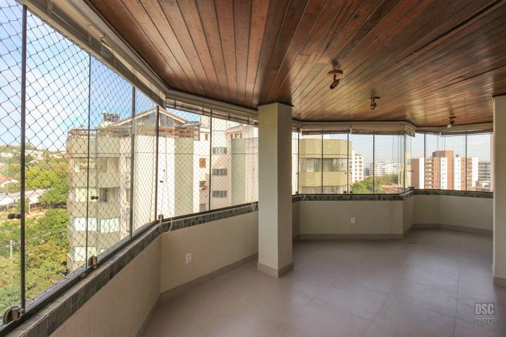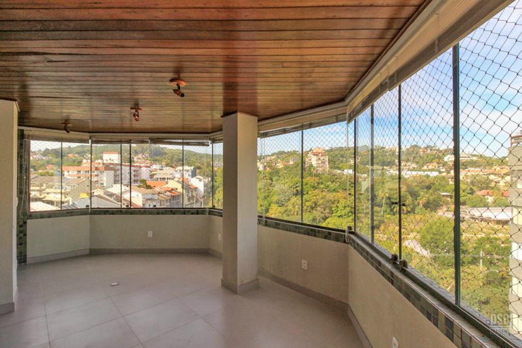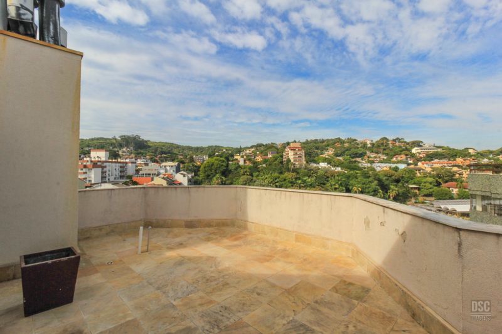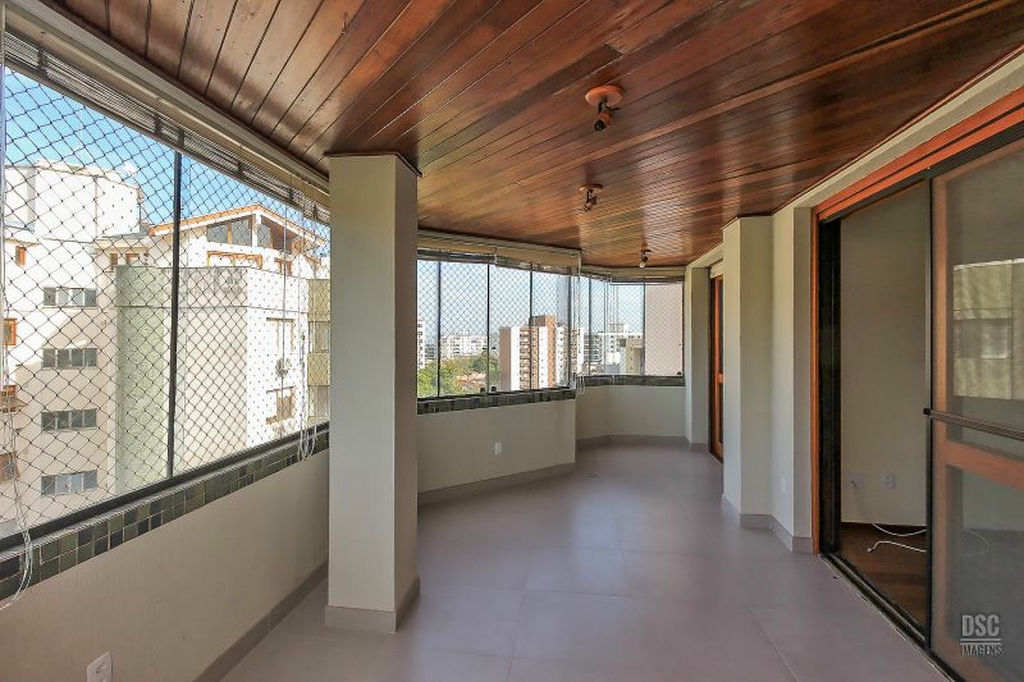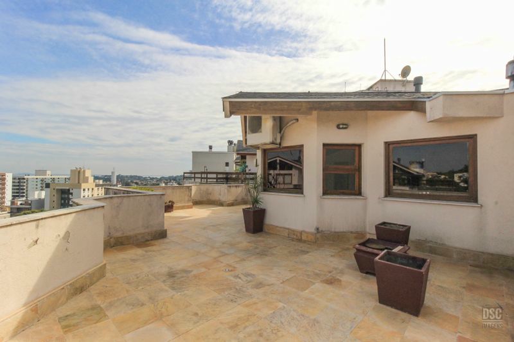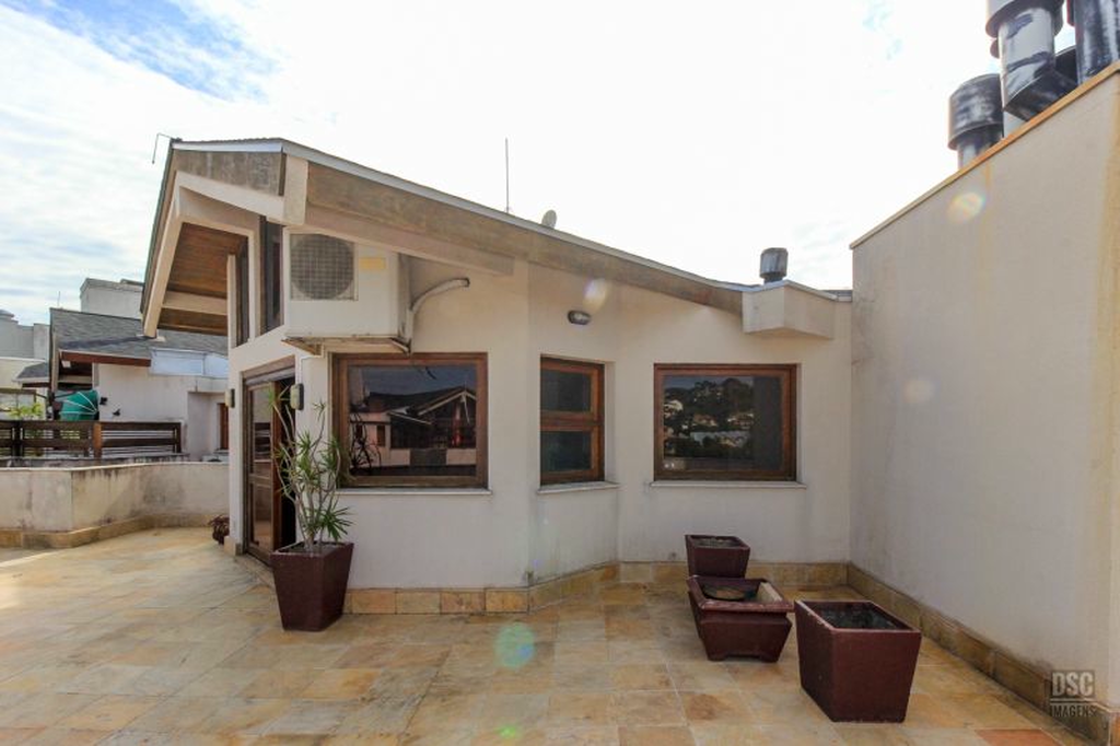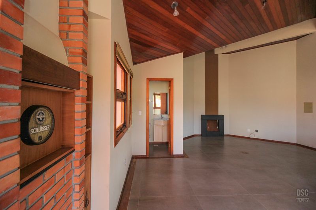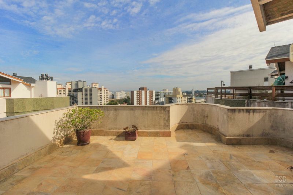 Parte superior, escada reta em madeira, amplo ambiente de estar com lareira e churrasqueira, terraço panorâmico, com vista do Guaíba e muito sol.