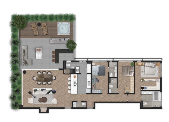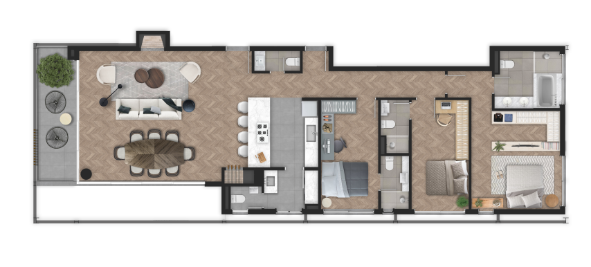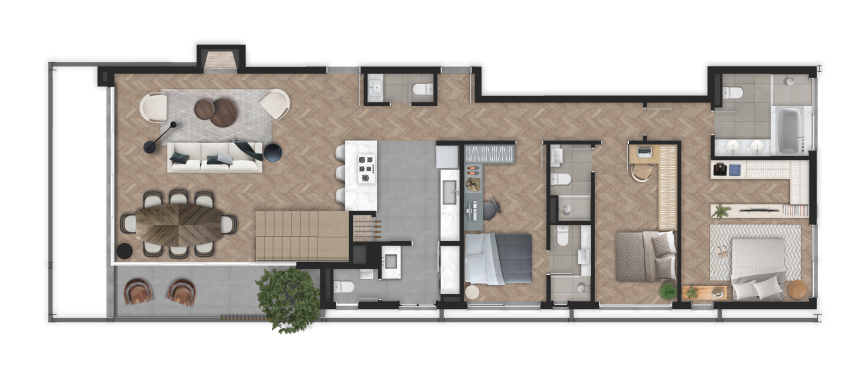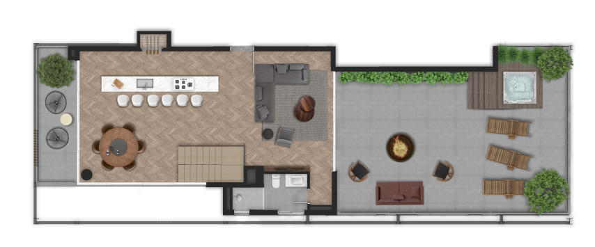 Um verdadeiro convite para a natureza da rua entrar no espaço íntimo, com amplos espaços comuns e privativos pensados para uma rotina contemporânea que flui naturalmente.