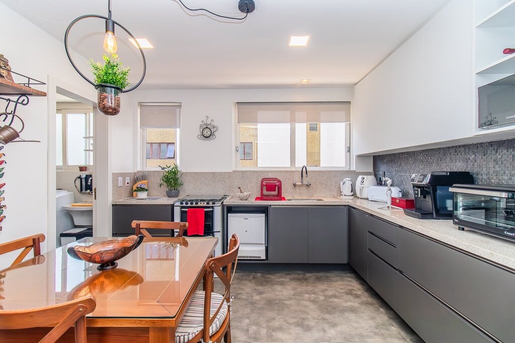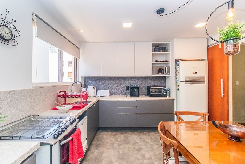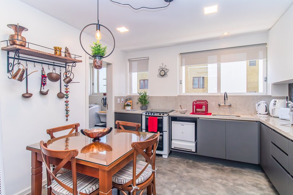 A copa-cozinha planejada é um espetáculo à parte, com materiais de primeira linha e espaço generoso para refeições em família.