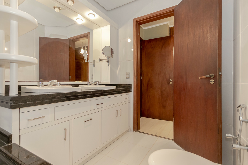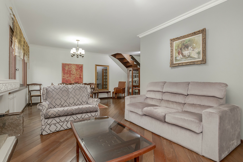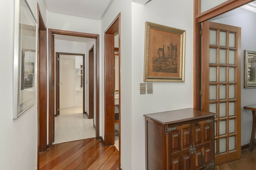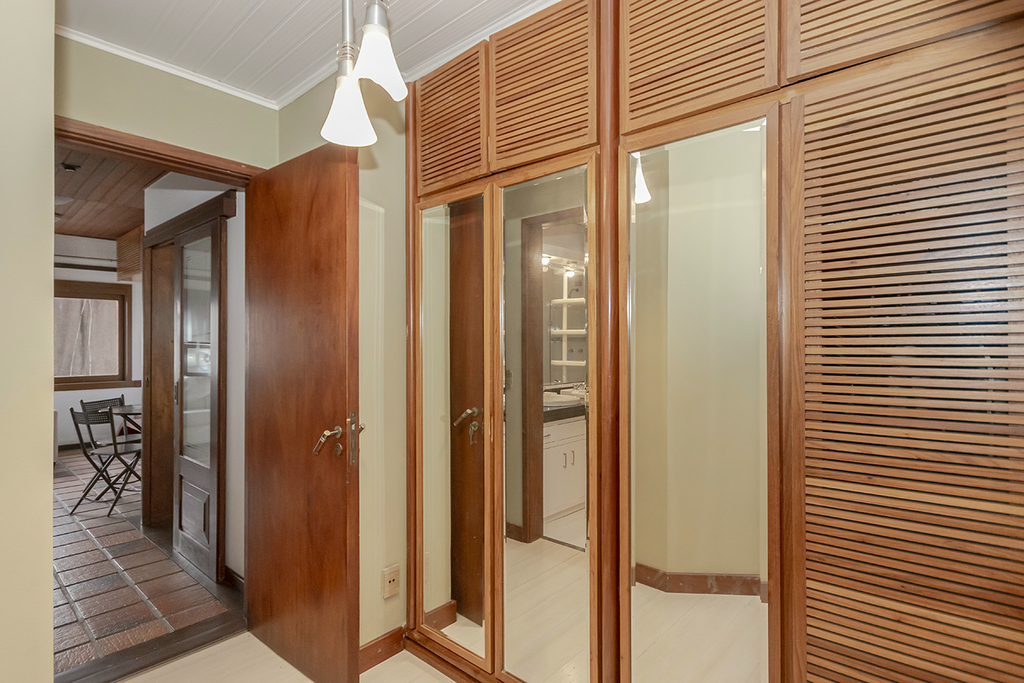 Quatro dormitórios sendo uma suíte master com closet e hidromassagem no pavimento superior pavimento inferior com três dormitórios e banho social renovado posições nascente norte e sul lareiras nos dois pavimentos.