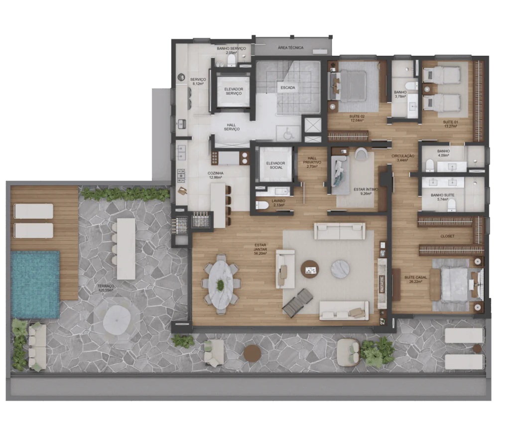 O resultado de tudo isso: muita privacidade e espaço para se viver com mais leveza. Apartamentos com 3 suítes, living integrado à sacada, churrasqueira, 3 vagas de garagem, automação de iluminação e personalização da planta.