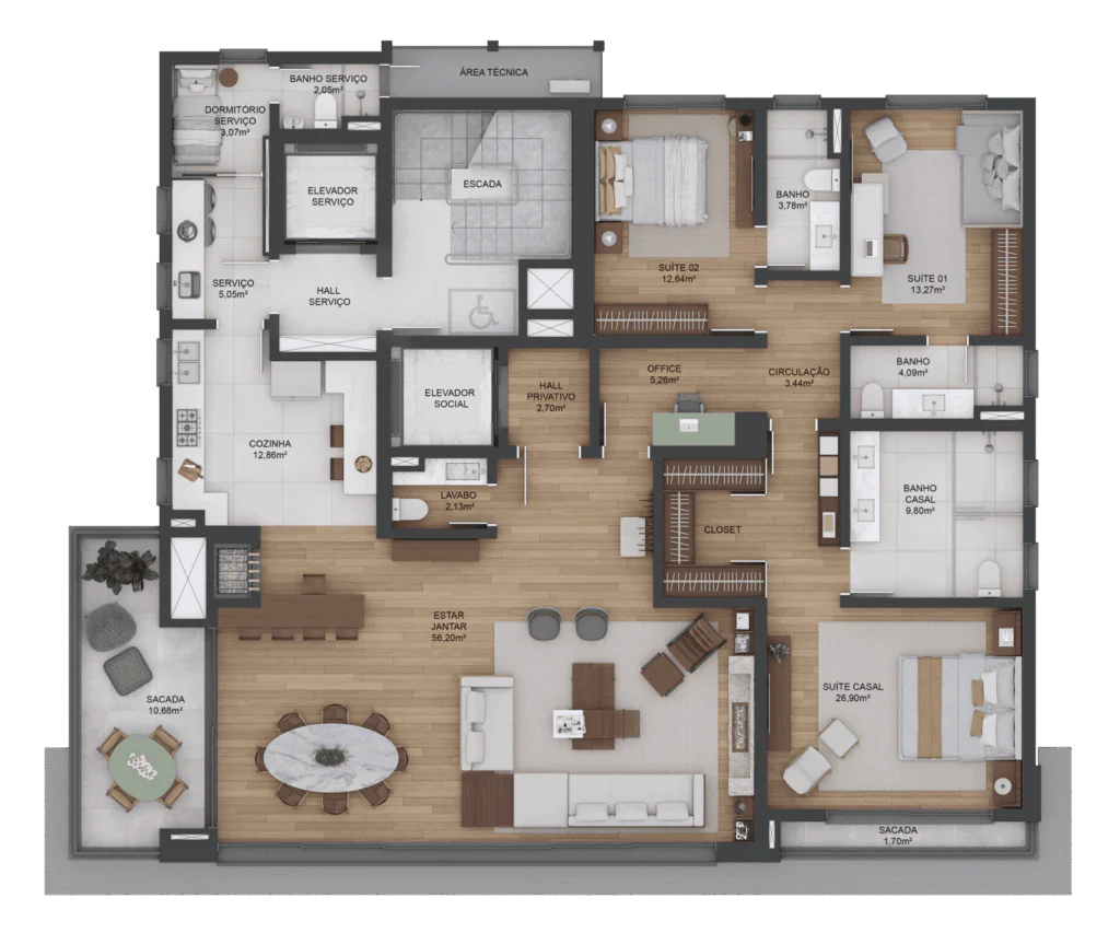 O resultado de tudo isso: muita privacidade e espaço para se viver com mais leveza. Apartamentos com 3 suítes, living integrado à sacada, churrasqueira, 3 vagas de garagem, automação de iluminação e personalização da planta.