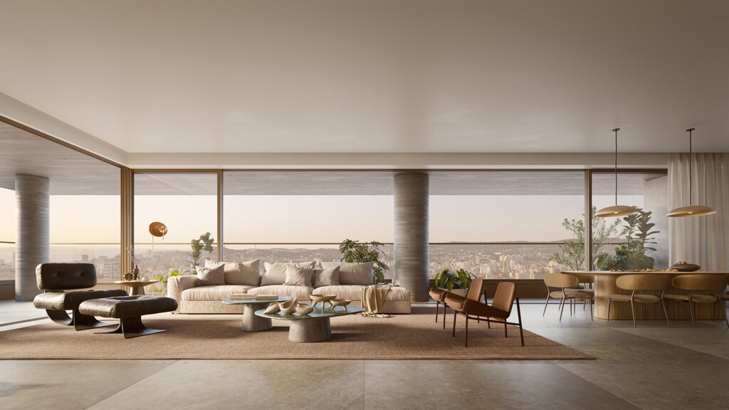Acima dos jacarandás, descortinam-se duas torres, cada uma com 18 pavimentos, que se mesclam ao céu.
