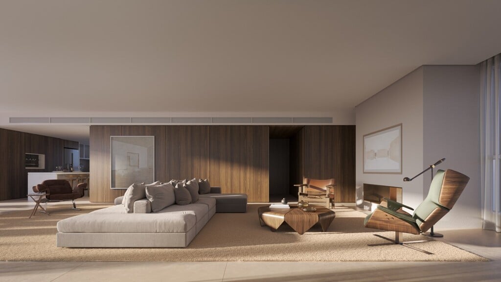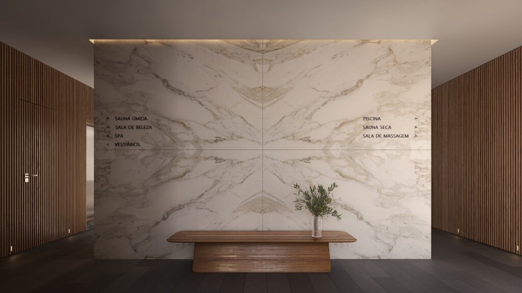 Acima dos jacarandás, descortinam-se duas torres, cada uma com 18 pavimentos, que se mesclam ao céu.