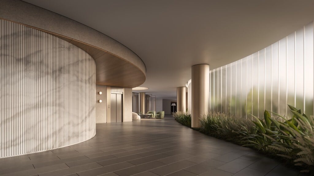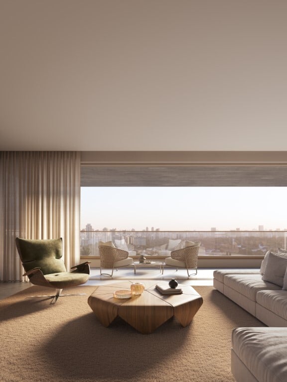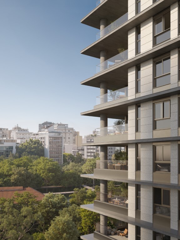 Acima dos jacarandás, descortinam-se duas torres, cada uma com 18 pavimentos, que se mesclam ao céu.