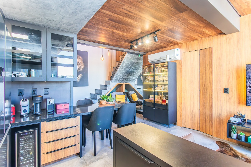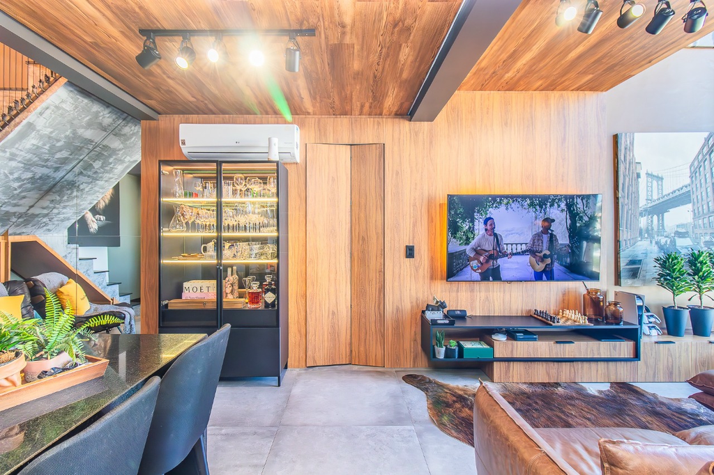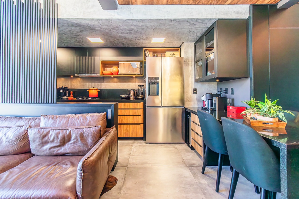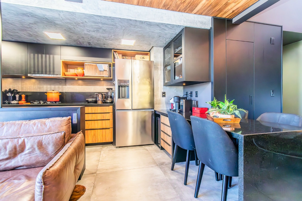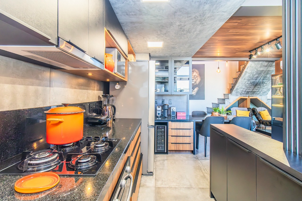O apartamento é dividido da seguinte maneira: - No andar inferior: um primeiro ambiente que integra sala de jantar, sala de estar com pé direito duplo e cozinha, além de um lavabo.