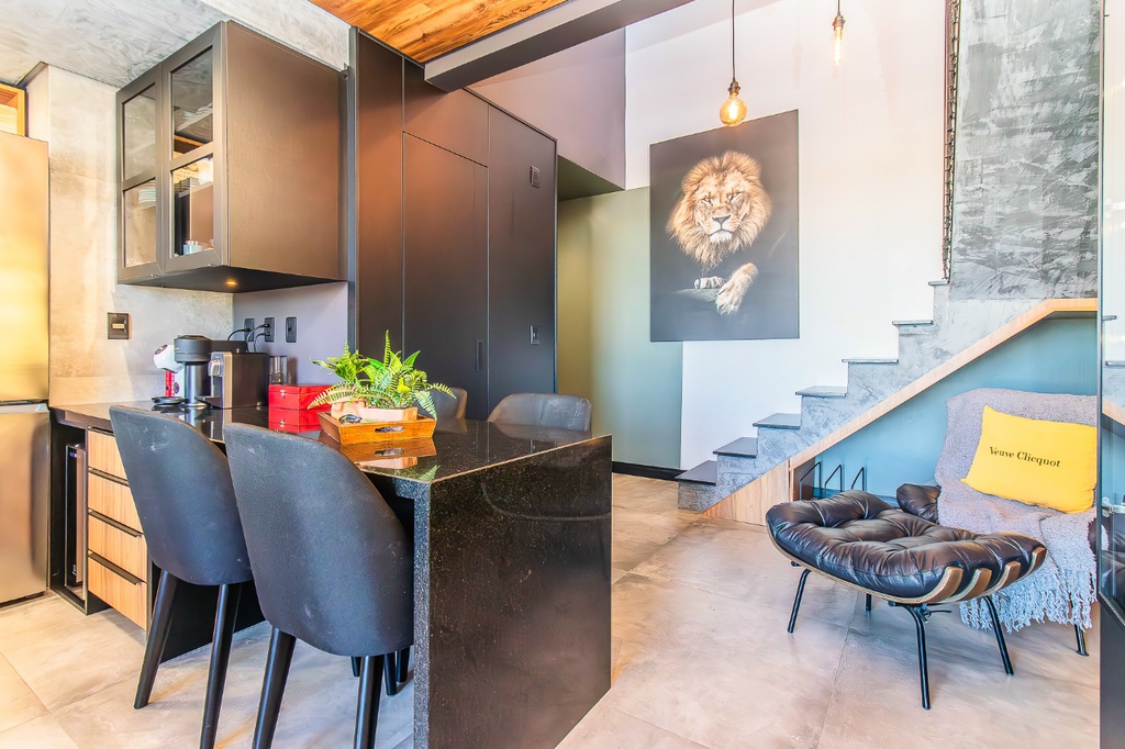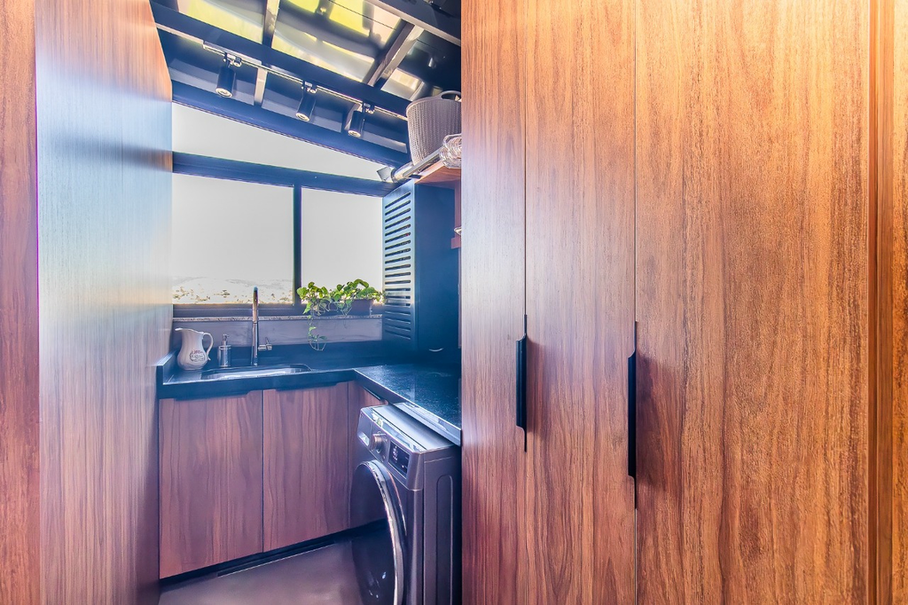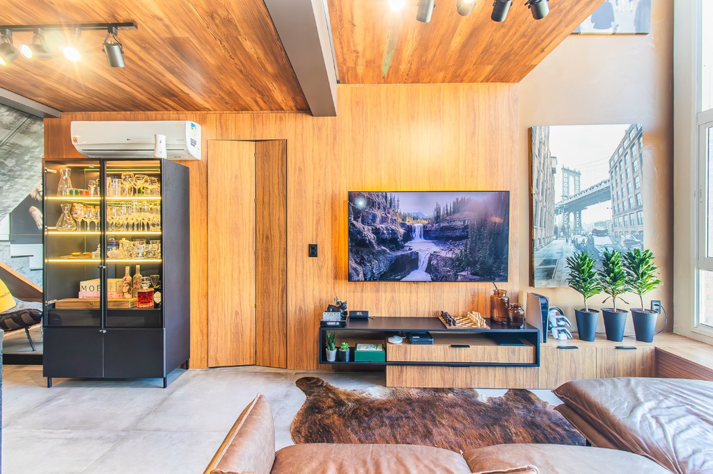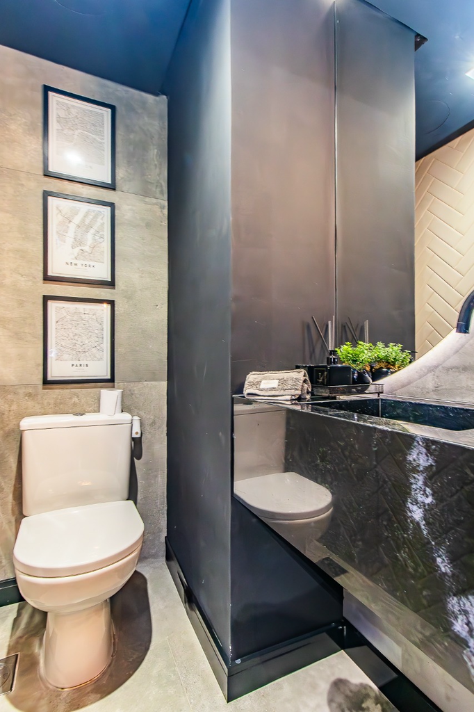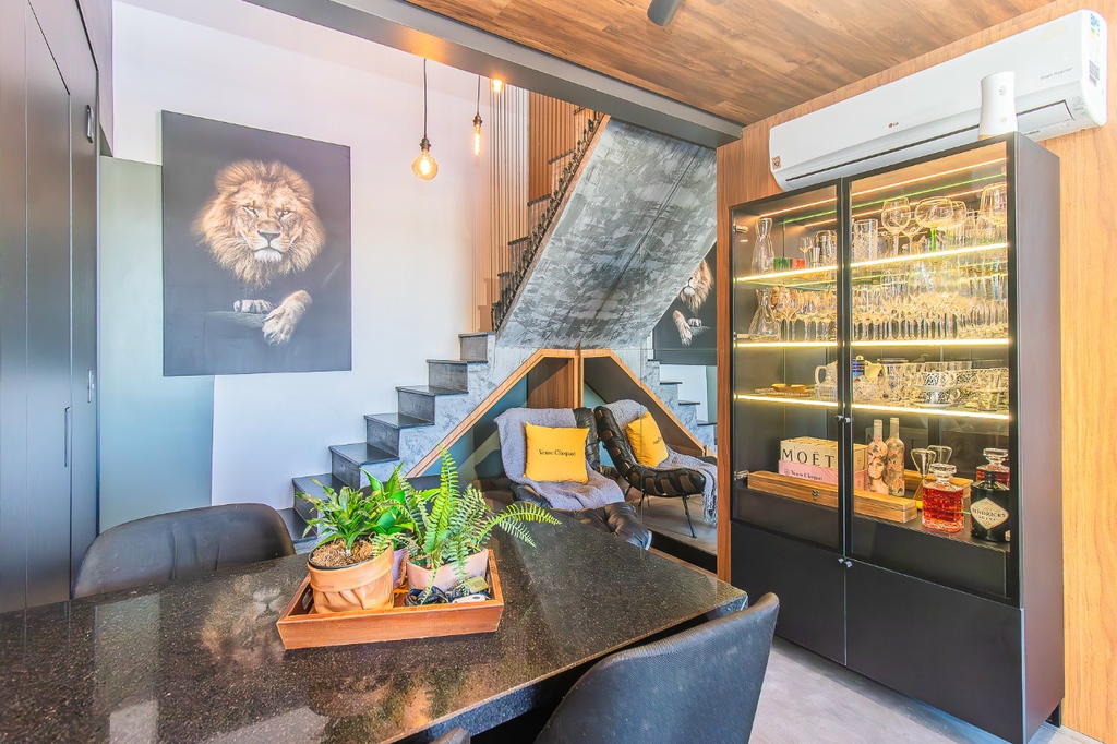 O apartamento é dividido da seguinte maneira: - No andar inferior: um primeiro ambiente que integra sala de jantar, sala de estar com pé direito duplo e cozinha, além de um lavabo.