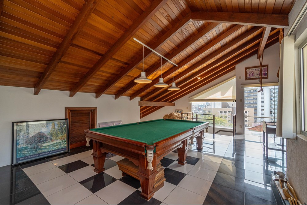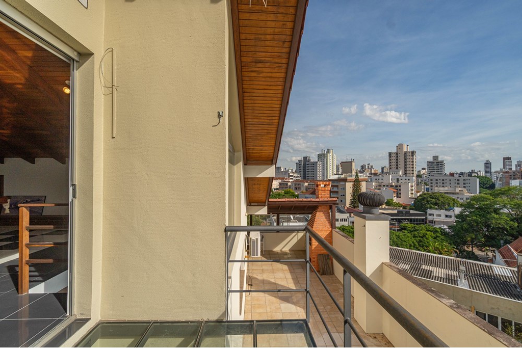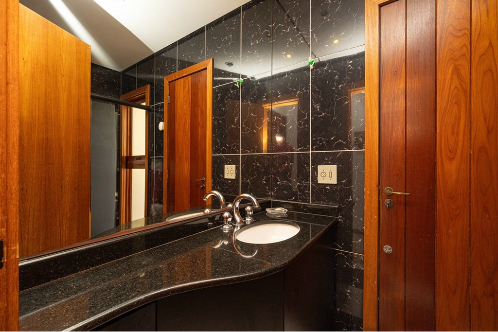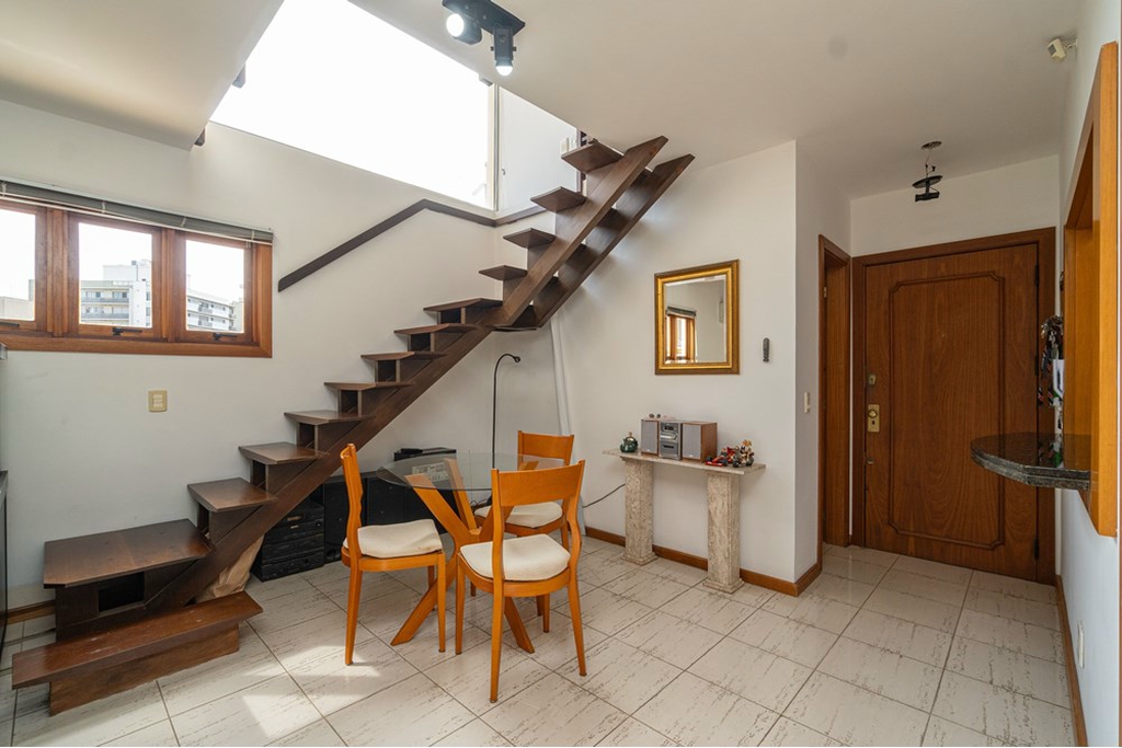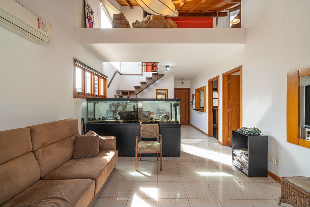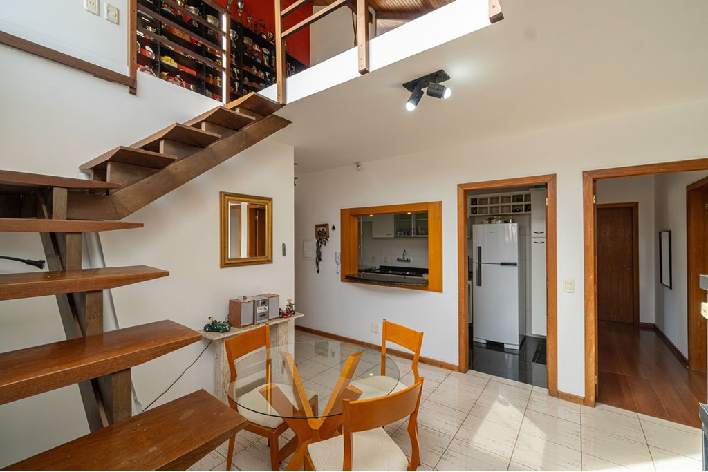 Na parte superior, um mezanino de 44 m² (não averbado) agrega ainda mais espaço e versatilidade ao imóvel. A sacada com piso de vidro contribui para a entrada de luz natural, ampliando a luminosidade e a sensação de amplitude.