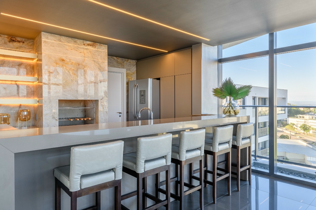 Dormitório com cama baú da Vivar, cozinha equipada com eletrodomésticos Brastemp e climatização garantida por dois aparelhos de ar condicionado Springer.