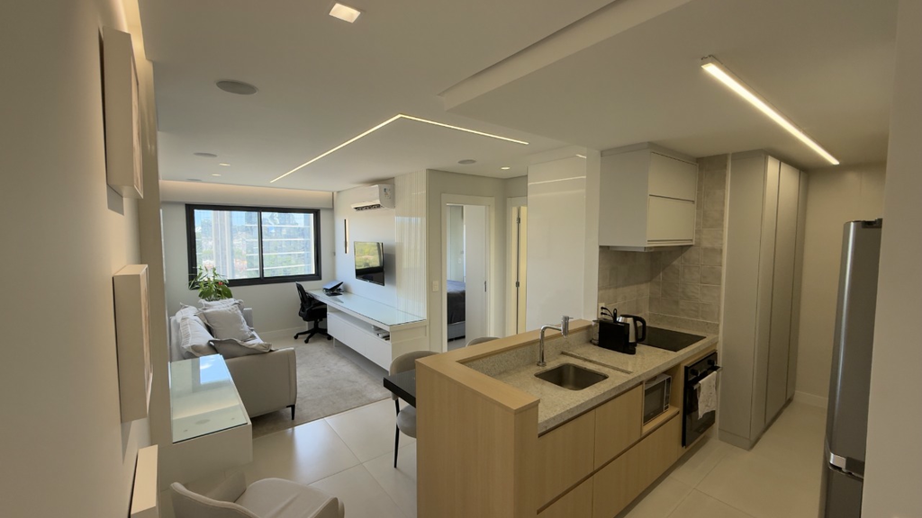 Apartamento com 43 m2 privativos projetado e decorado com layout integrado, som embutido, iluminação cênica e obras originais da Urban Arts.