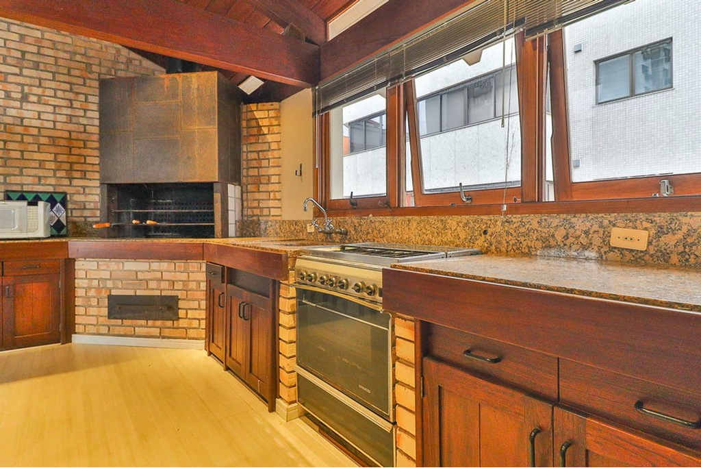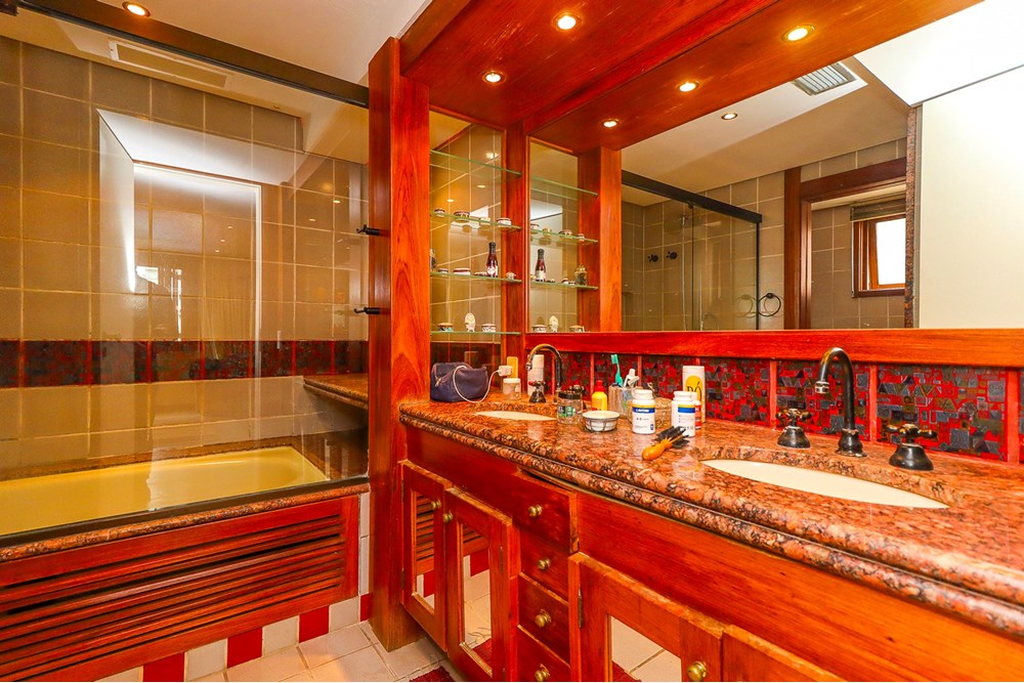 A parte superior lembra uma casa da Serra, com detalhes em madeira de lei, 2 terraços sendo um frontal com jacuzzi e outro maior com lavanderia e banheiro de apoio, além de salão de festas com vários layouts, bar em madeira com cozinha americana, churrasqueira com acabamento exclusivo, lareira e mais um ambiente que pode ser utilizado como 5º dormitório, escritório, academia ou atelier.
