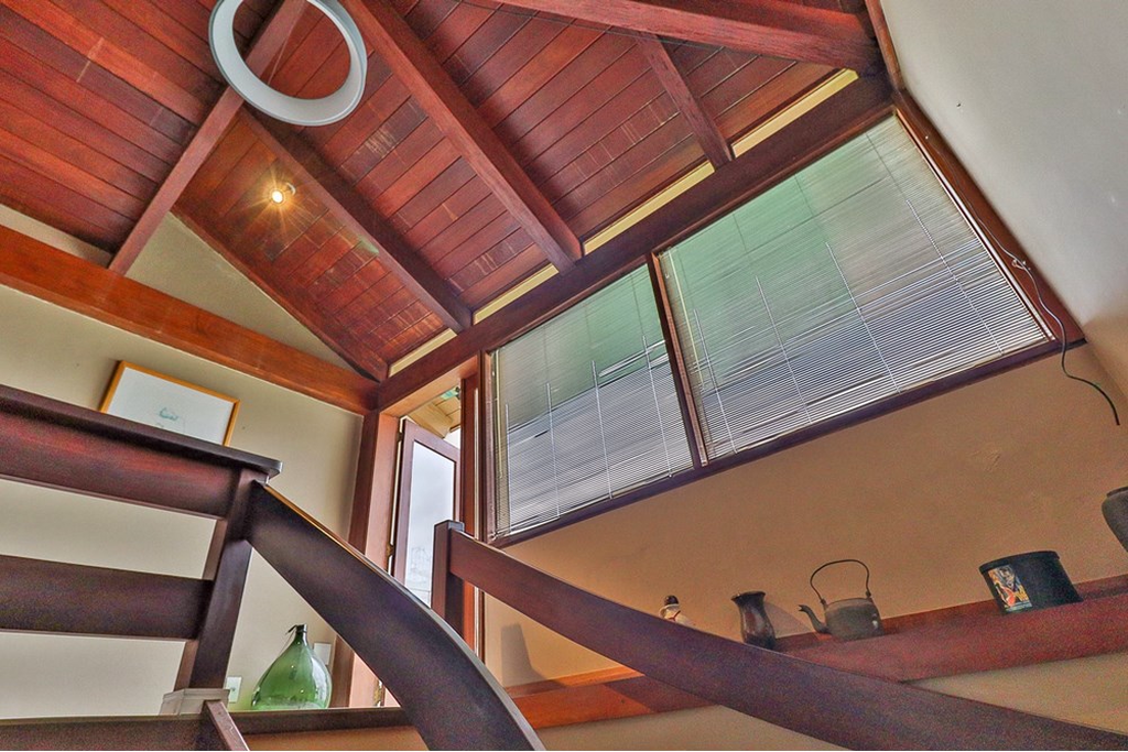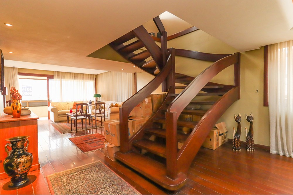O imóvel oferece muito espaço social com living em tabuão com lareira e varanda, cozinha ampla com mesa de refeições, lavanderia e dependência completa, além de 4 dormitórios amplos, incluindo suíte com closet e espaçoso quarto de banho. A escada em madeira nobre de dois lances é um destaque arquitetônico e de design.