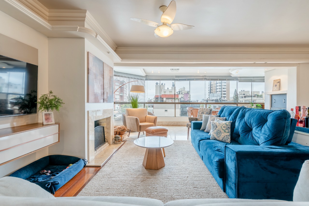 Living amplo, com sacada integrada, churrasqueira e lareira, cozinha com área de serviço separada e banheiro auxiliar.