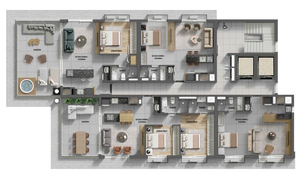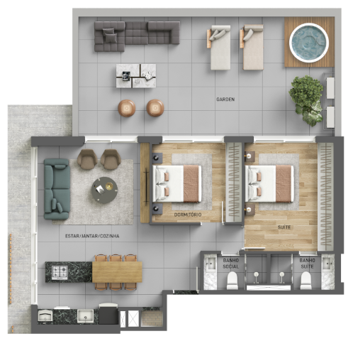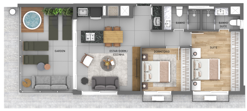 Juntamente com as áreas condominiais de lazer, posicionadas no rooftop, que contam com fitness, espaço gourmet e garden externo.