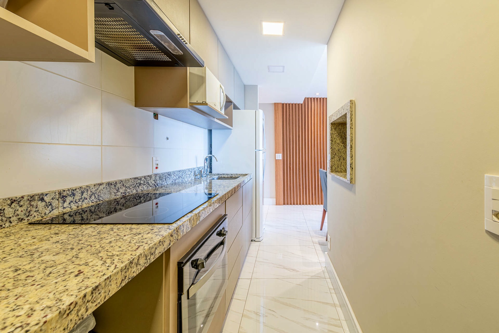 O studio conta com living espaçoso, cozinha americana, área de dormir bem definida e banheiro completo.