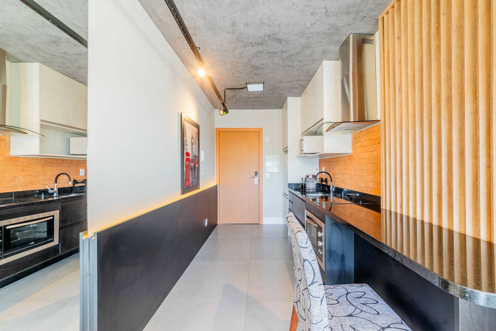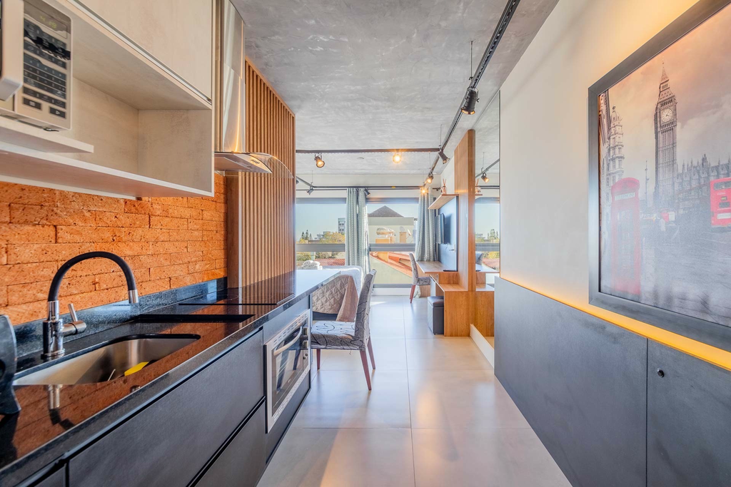 Apartamento compacto totalmente decorado e mobiliado em andar alto e ótima posição solar, com 28,41m² de área privativa.