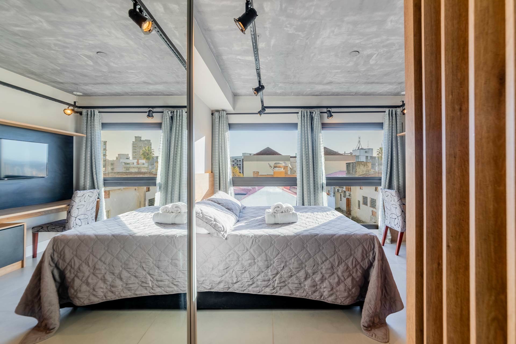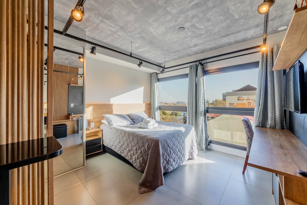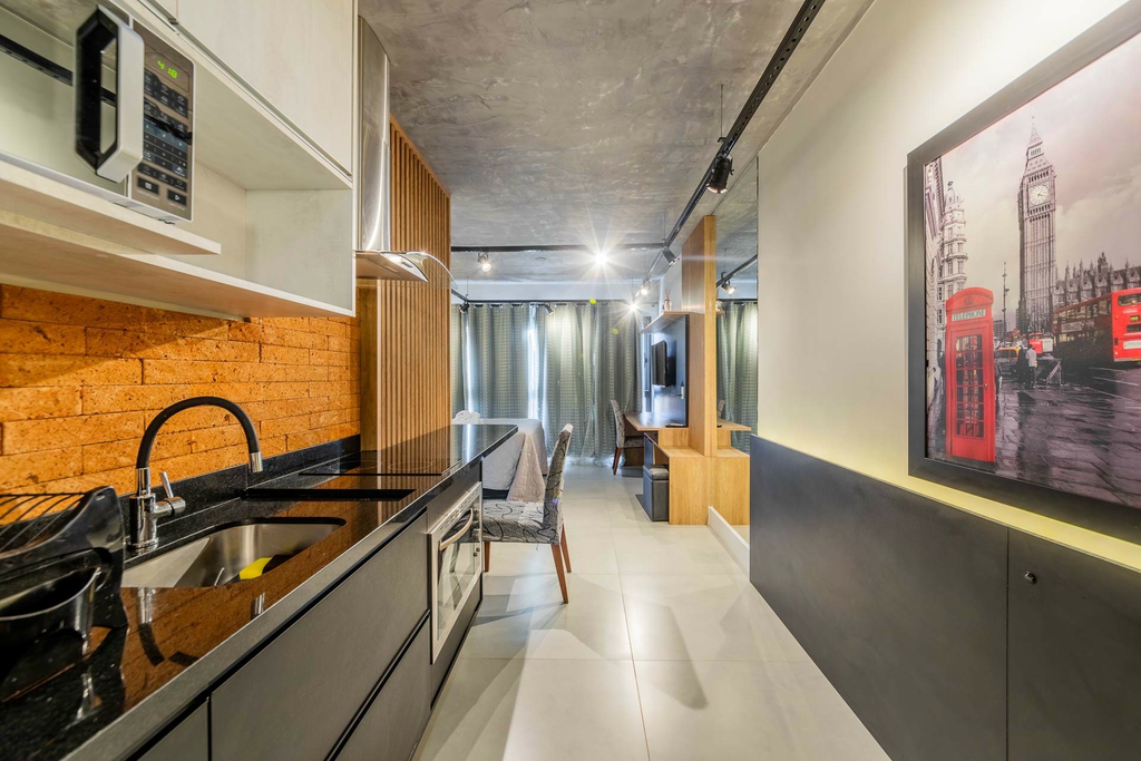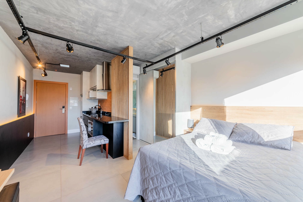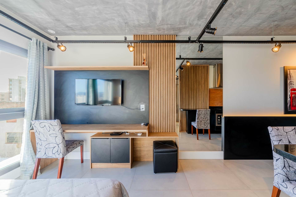 Ambientes de living, dormitório e cozinha integrados e com esquadrias do teto ao chão, e banheiro social.