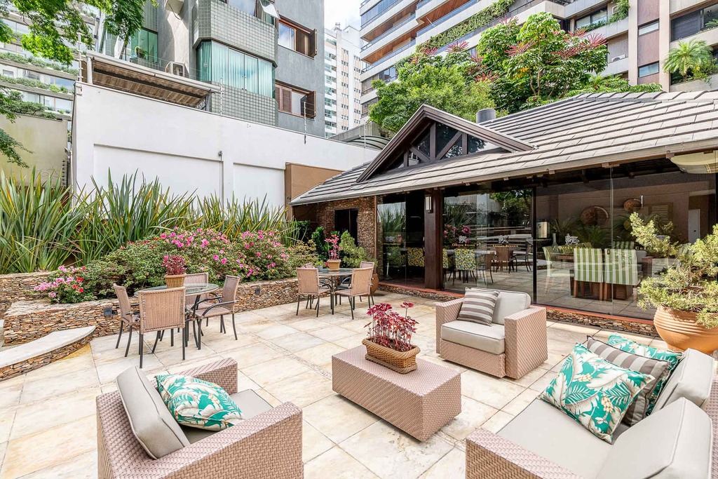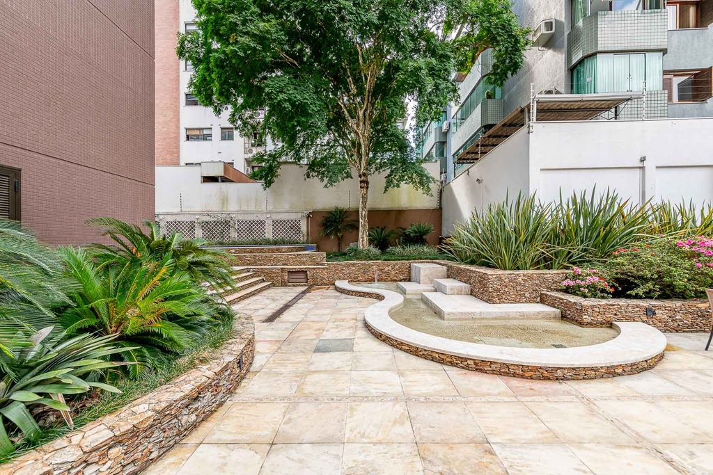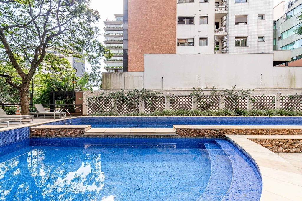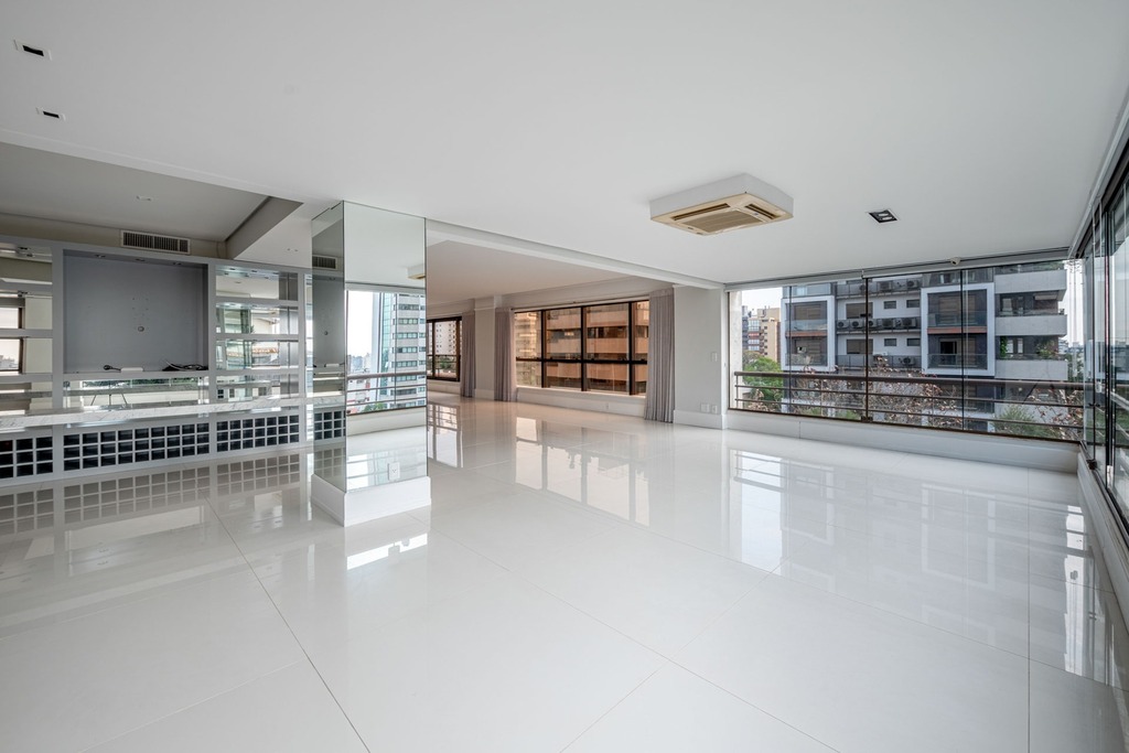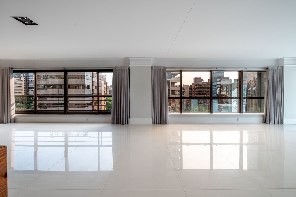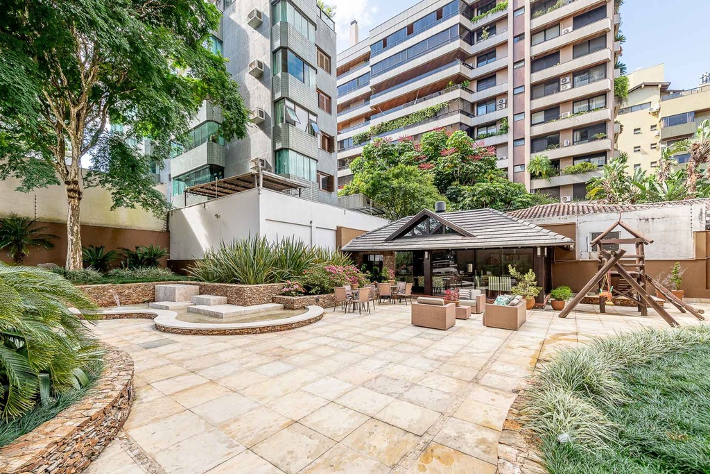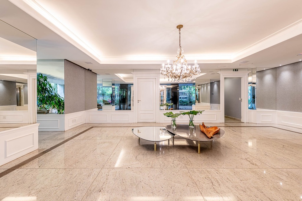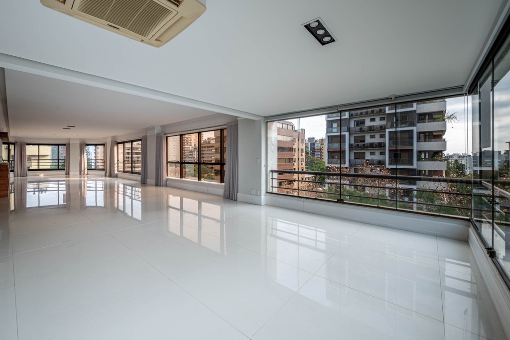Apartamento 1 por andar, hall privativo, 4 suítes transformadas em 3 amplas suítes, a master com banheiro e closet ele e ela. Living para 4 ambientes com lareira, sala de jantar com espaço gourmet e churrasqueira, copa-cozinha, dependência completa de empregada.