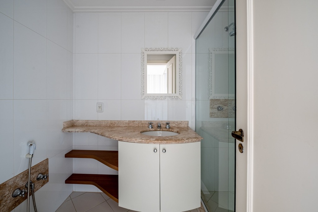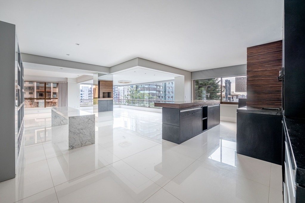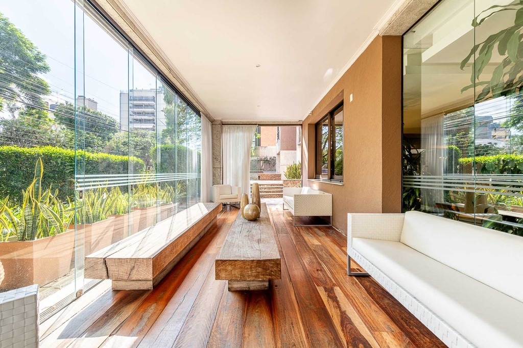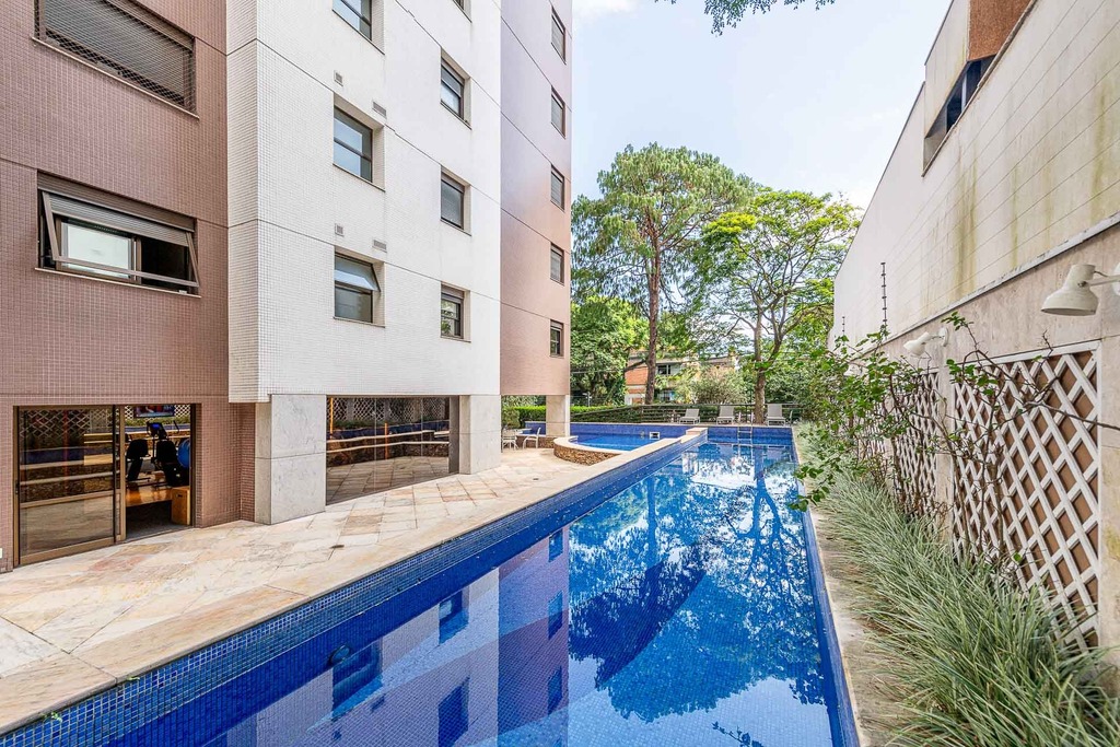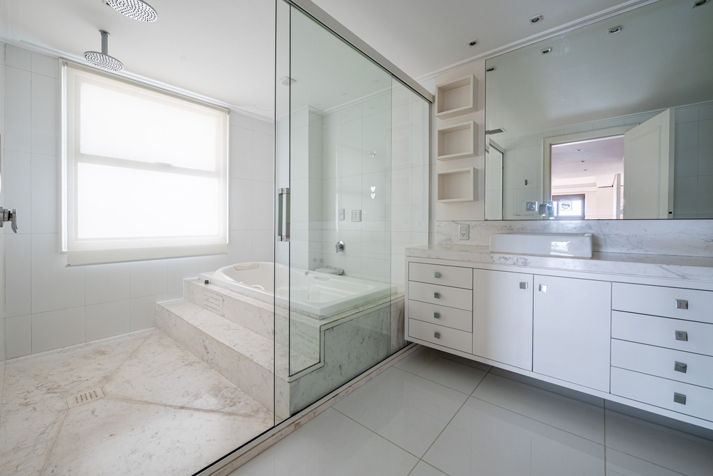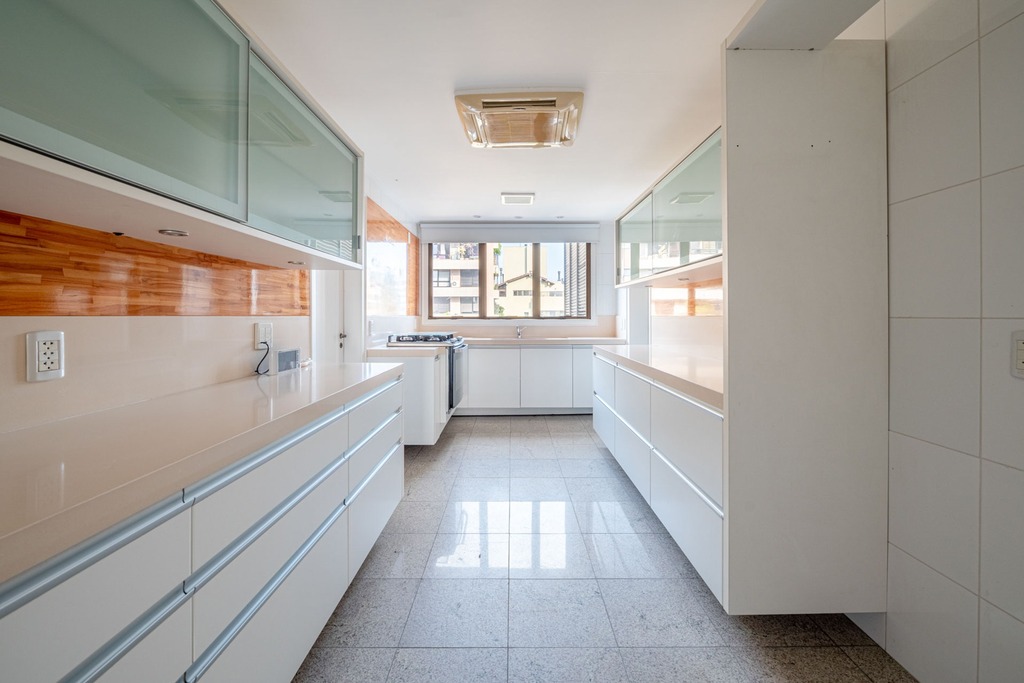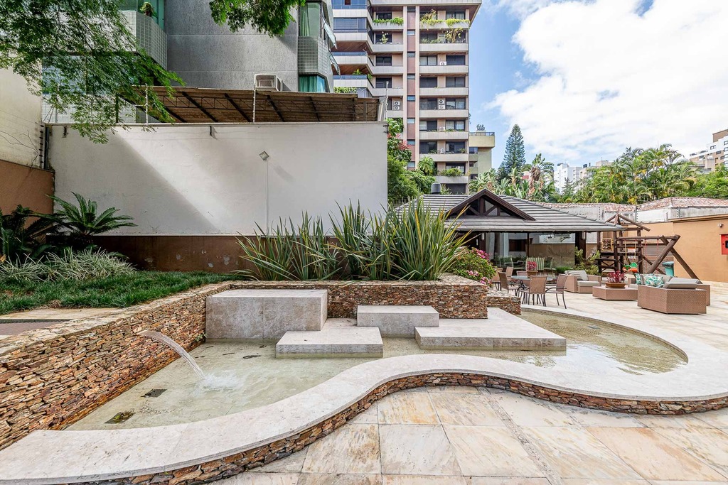 Apartamento 1 por andar, hall privativo, 4 suítes transformadas em 3 amplas suítes, a master com banheiro e closet ele e ela. Living para 4 ambientes com lareira, sala de jantar com espaço gourmet e churrasqueira, copa-cozinha, dependência completa de empregada.