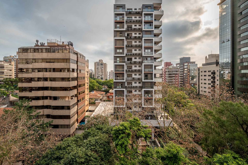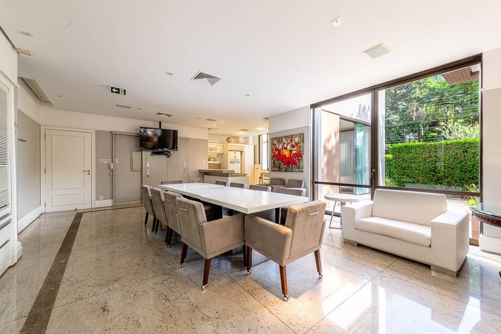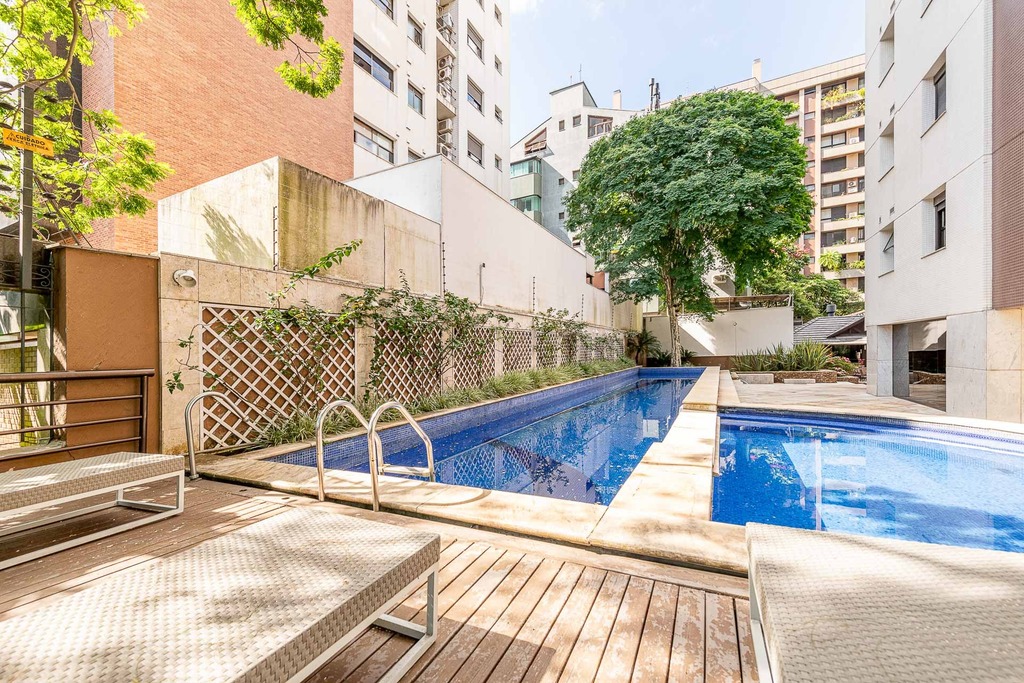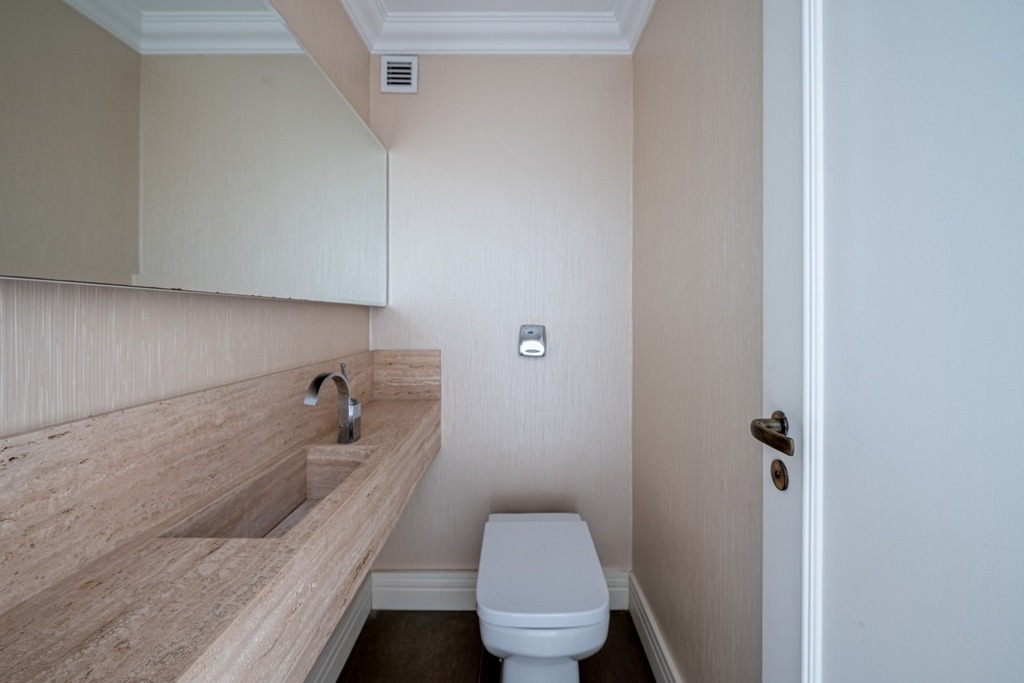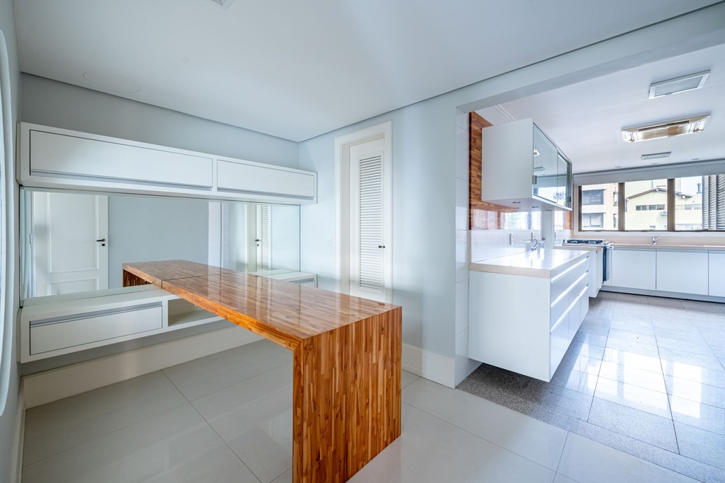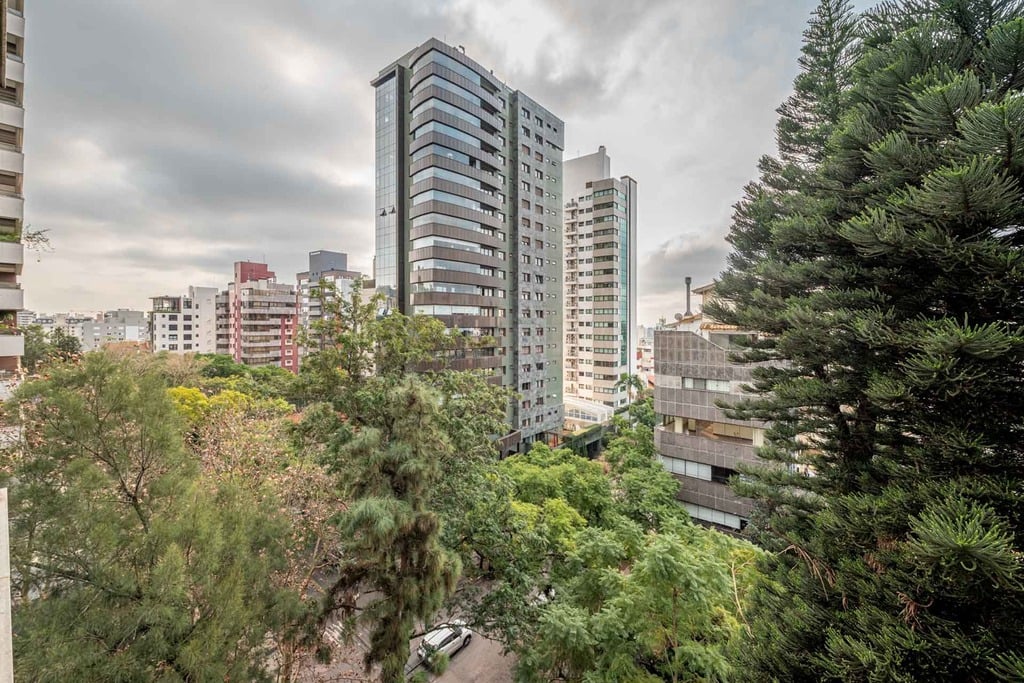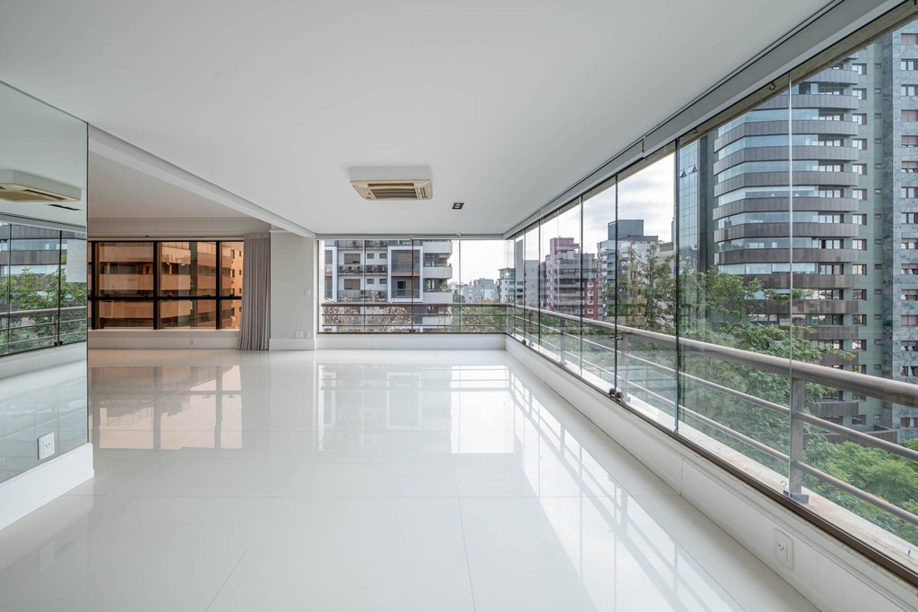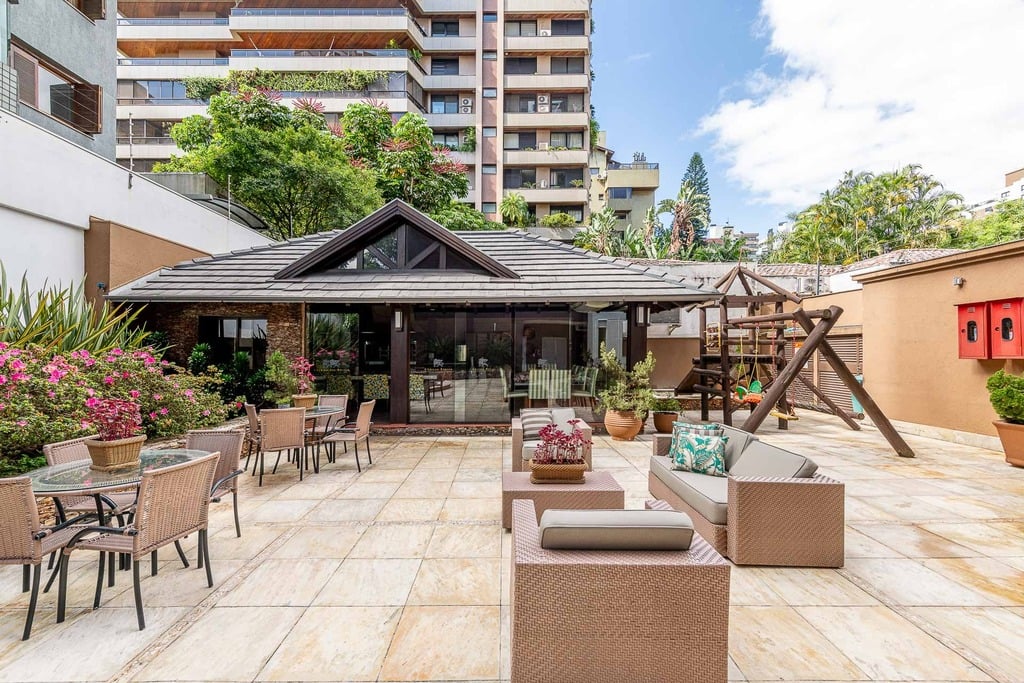 Apartamento 1 por andar, hall privativo, 4 suítes transformadas em 3 amplas suítes, a master com banheiro e closet ele e ela. Living para 4 ambientes com lareira, sala de jantar com espaço gourmet e churrasqueira, copa-cozinha, dependência completa de empregada.
