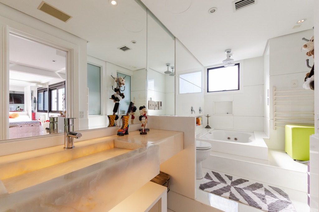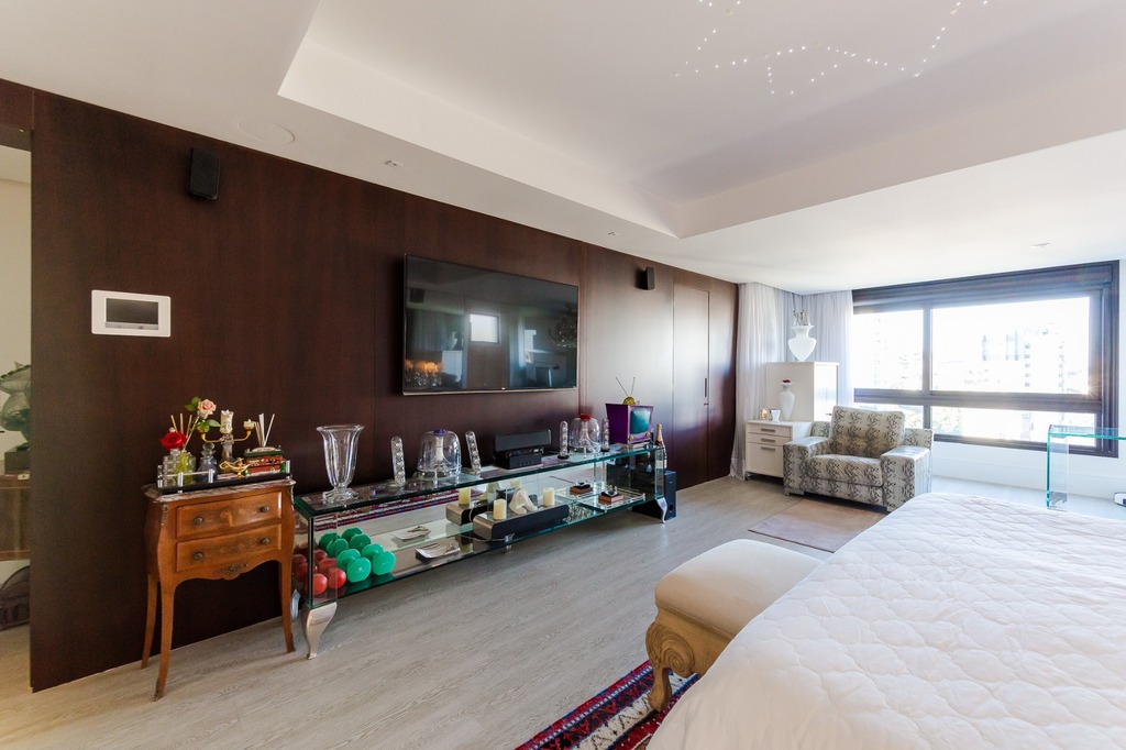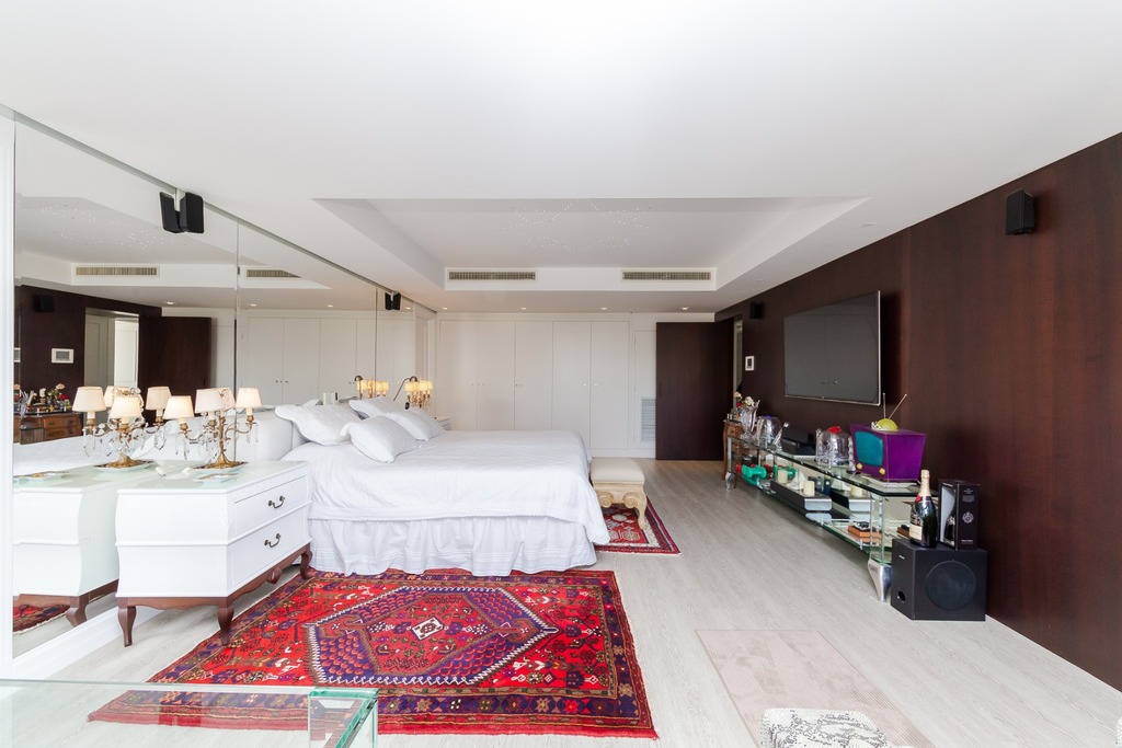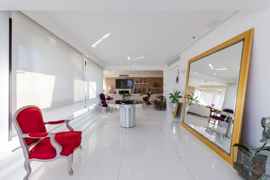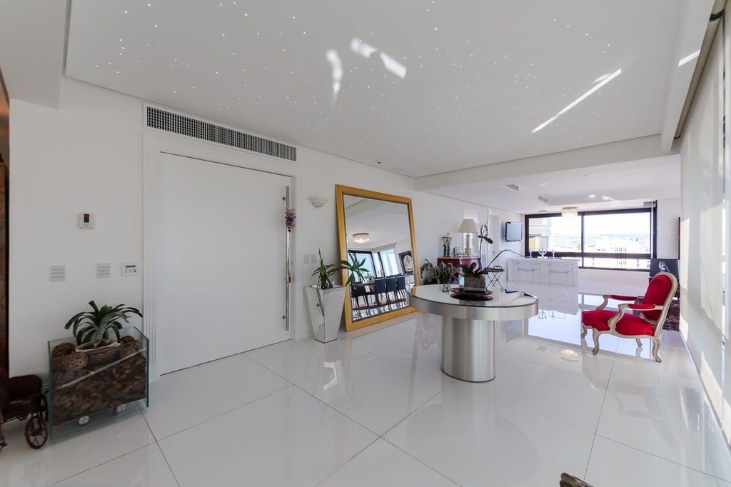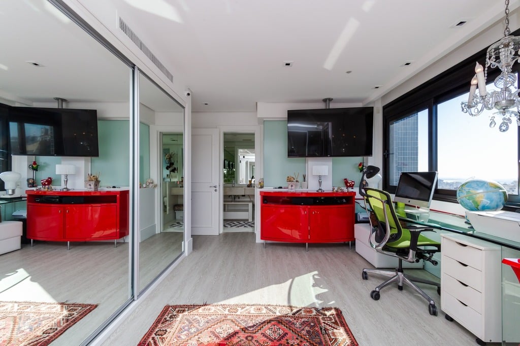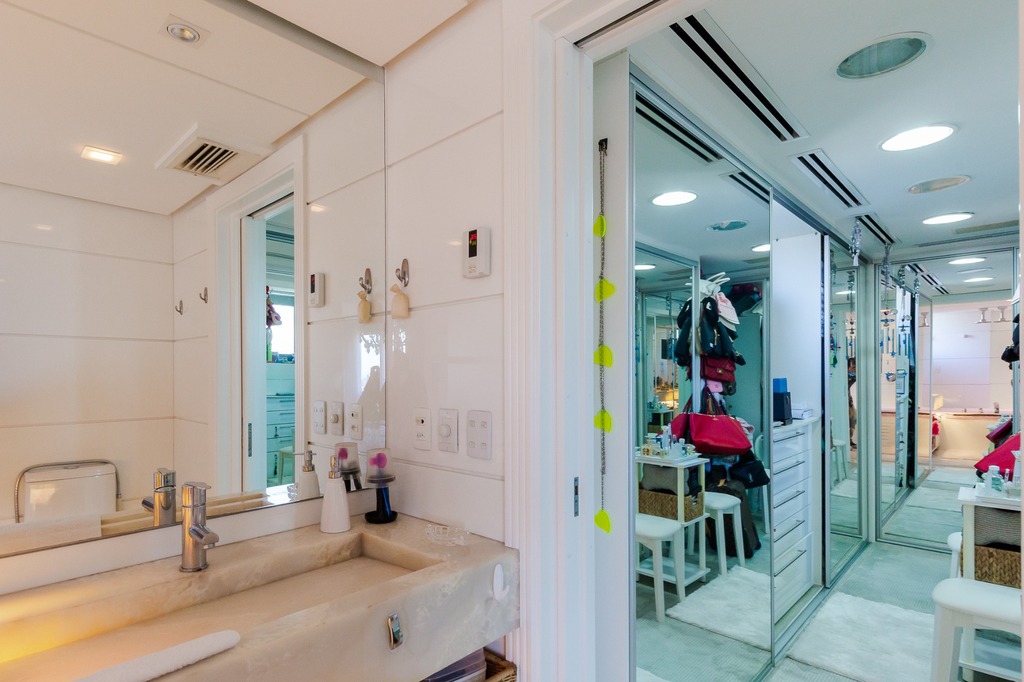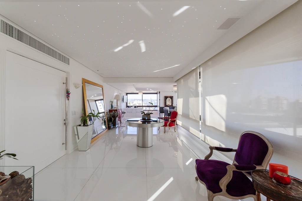 O apartamento está equipado com um sistema de automação para cortinas, persianas e iluminação, além de ar condicionado inteligente em todos os ambientes.