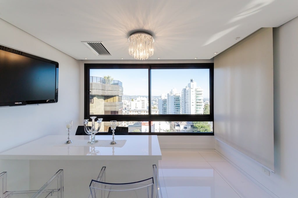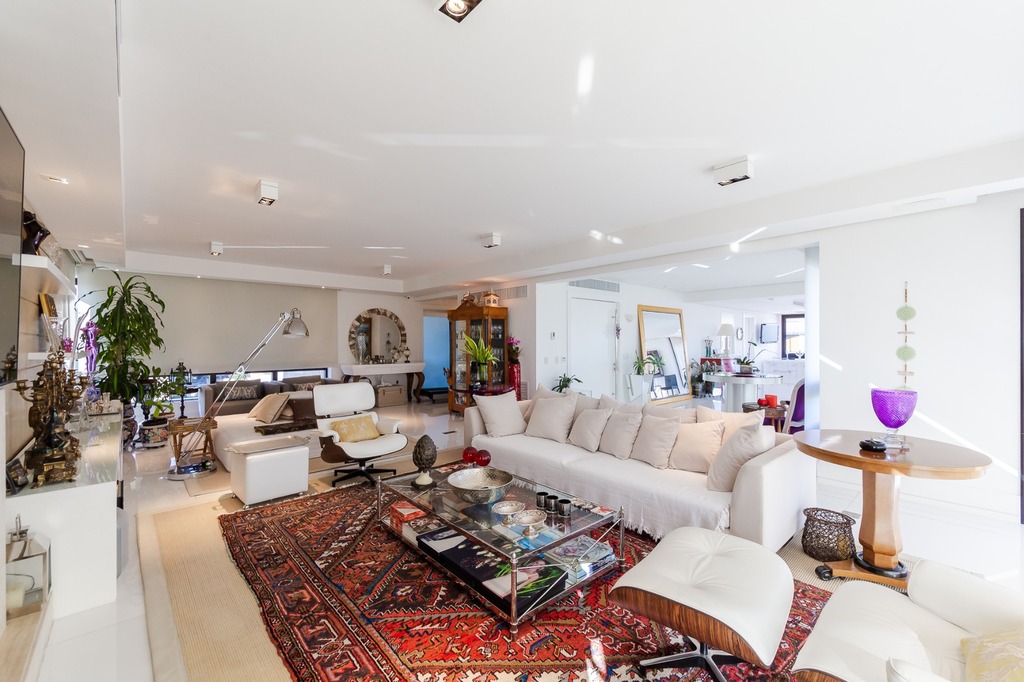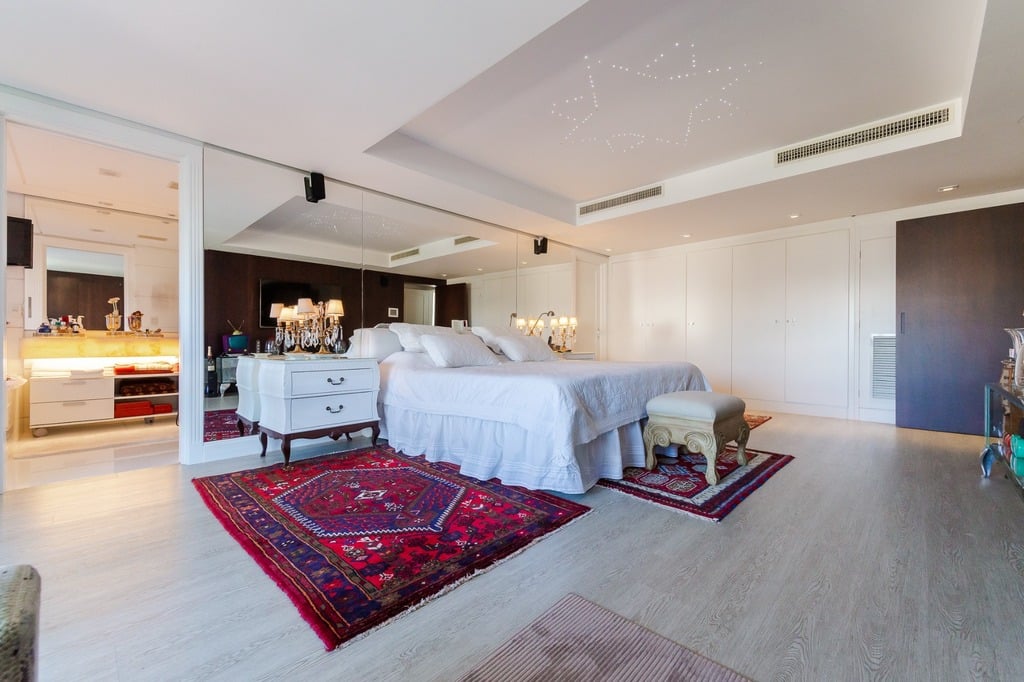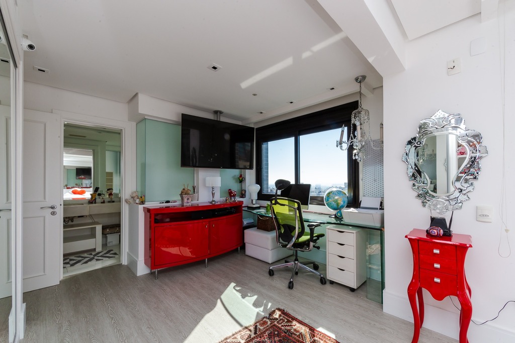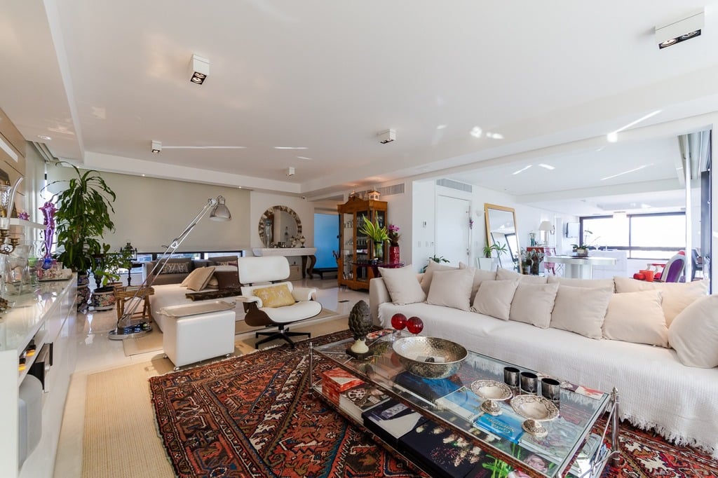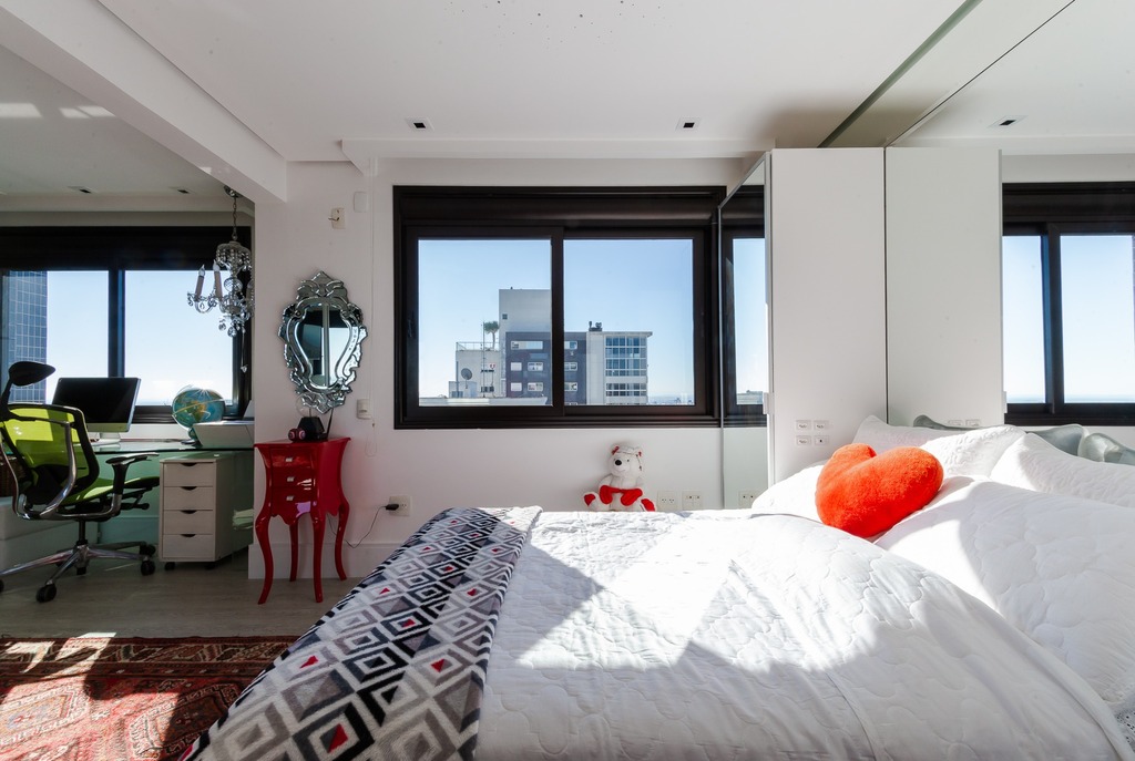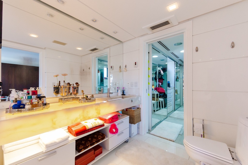 O apartamento está equipado com um sistema de automação para cortinas, persianas e iluminação, além de ar condicionado inteligente em todos os ambientes.