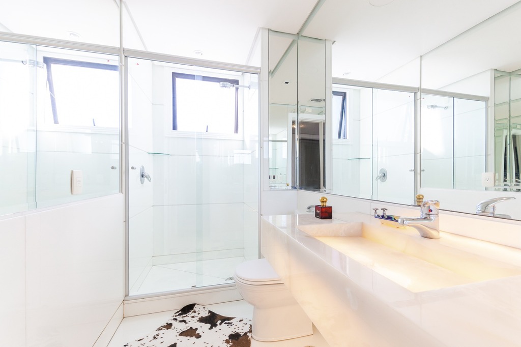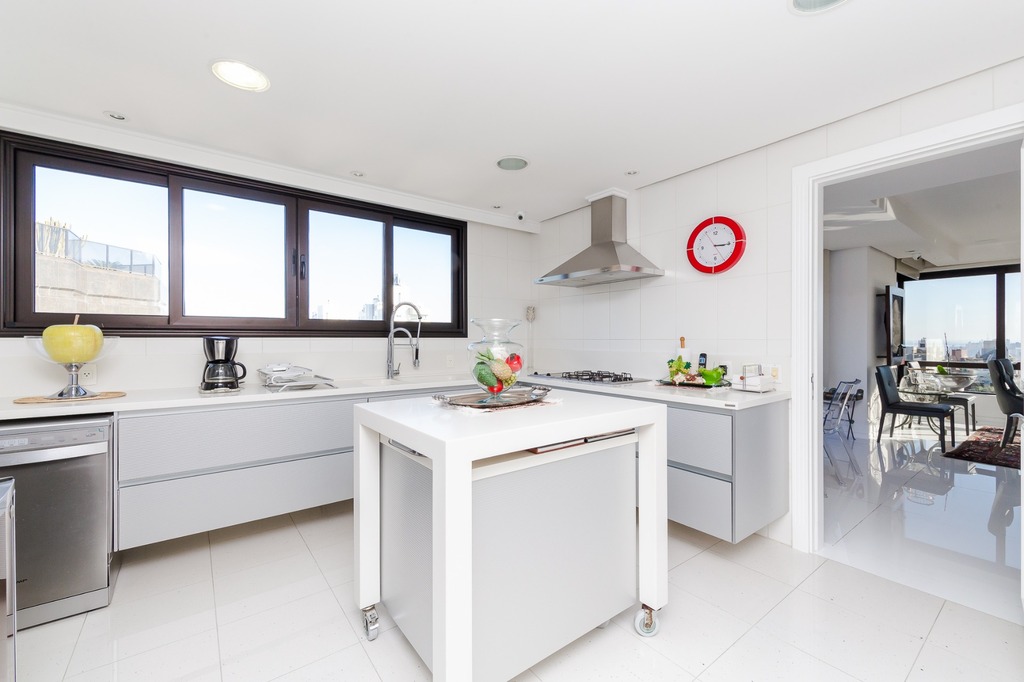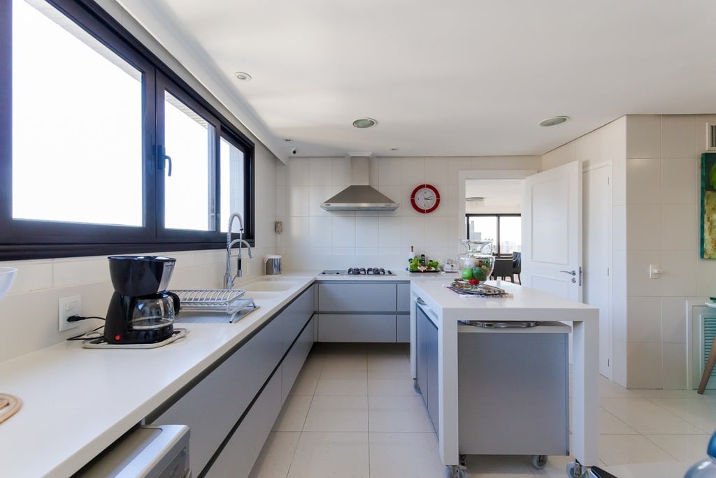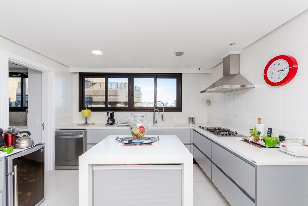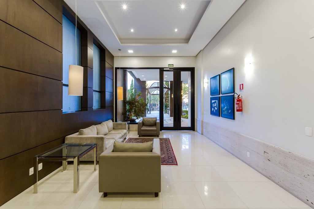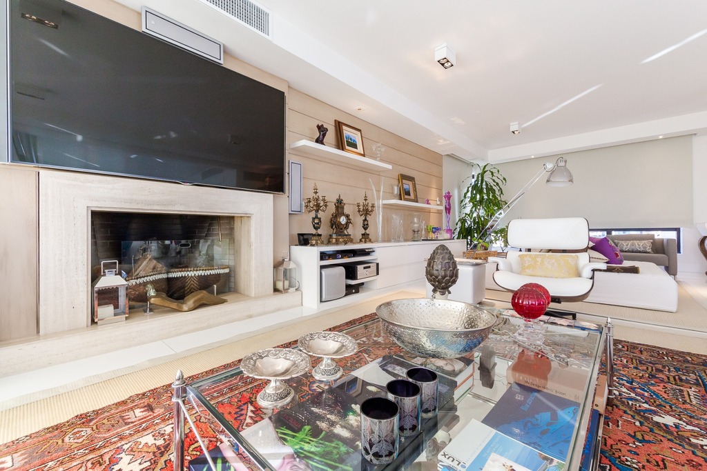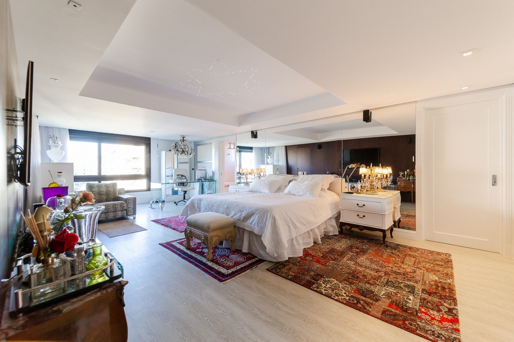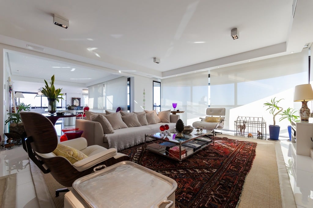 O apartamento está equipado com um sistema de automação para cortinas, persianas e iluminação, além de ar condicionado inteligente em todos os ambientes.