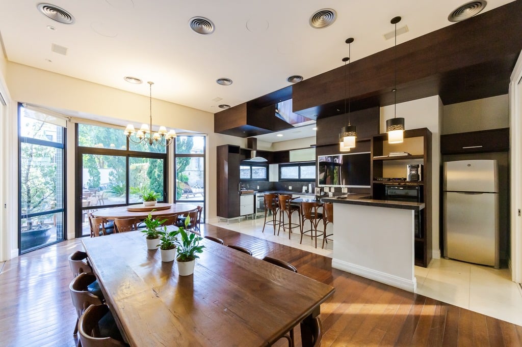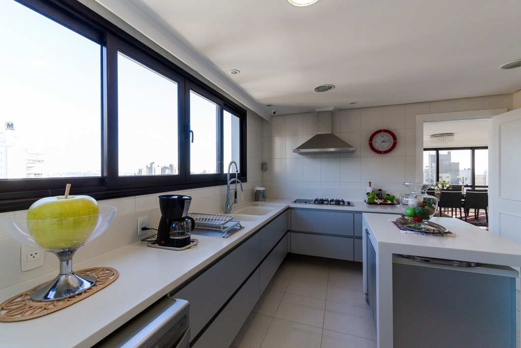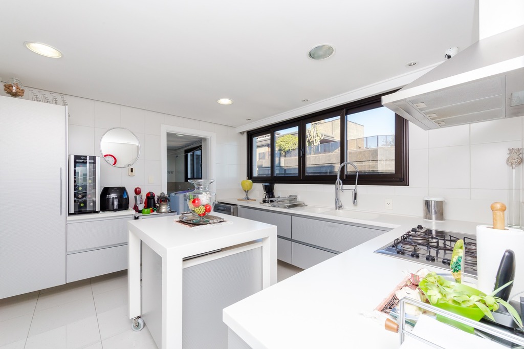 O espaço gourmet com churrasqueira, lareira e lavabo complementa este ambiente refinado. A copa-cozinha, equipada com móveis planejados Kitchens, despensa e área de serviço com entrada independente, inclui dormitório e banheiro de serviço.