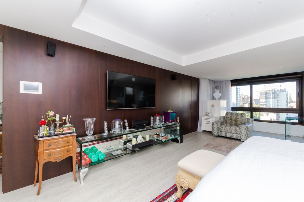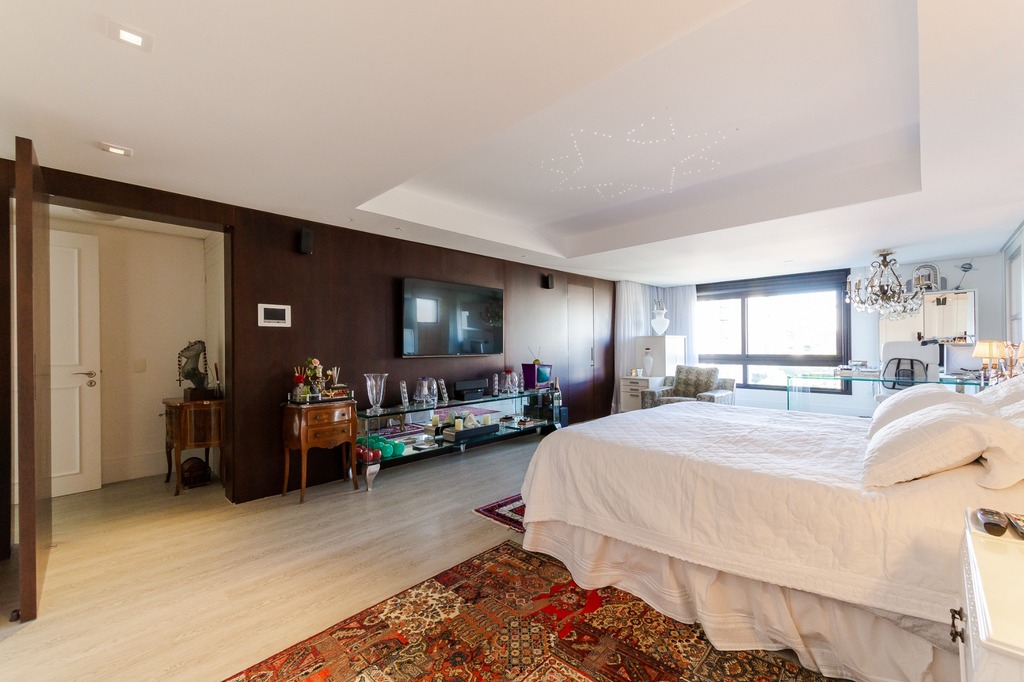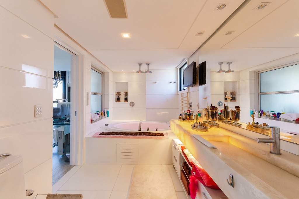 A área íntima é diferenciada, atualmente configurada com três suítes, com opção para uma quarta suíte ou gabinete/home office, além de espaço para uma ampla adega privativa. A suíte master destaca-se com banheiro ele/ela, com jacuzzi, sauna, hidromassagem vertical e pisos aquecidos. Os banheiros e chuveiros possuem cromoterapia, proporcionando um ambiente de bem-estar e relaxamento.