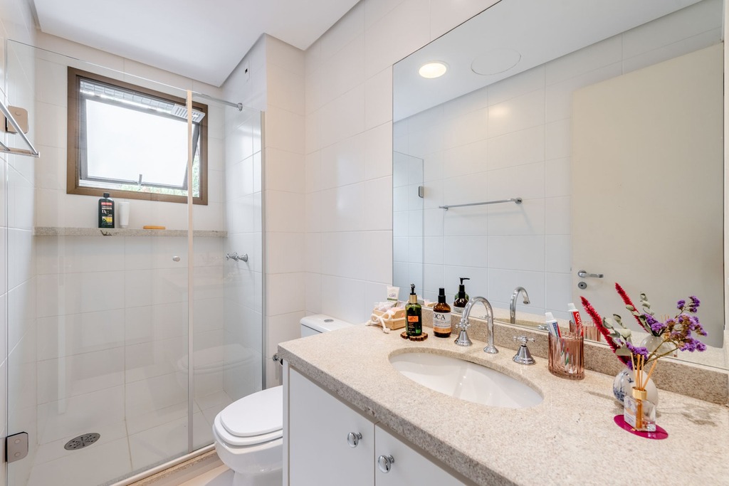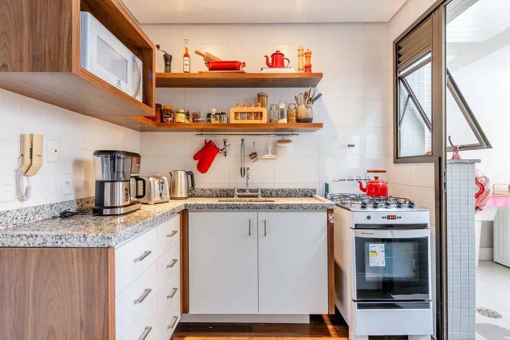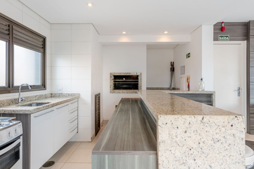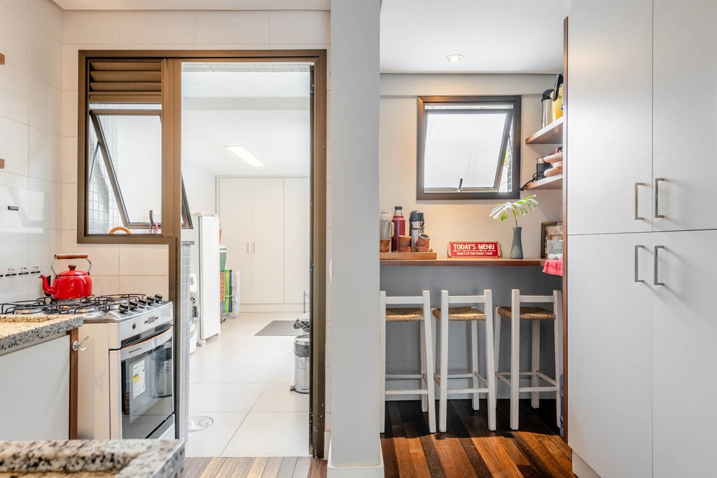 O living com dois ambientes é integrado à churrasqueira e à cozinha montada, que conta com generosa área de serviço.