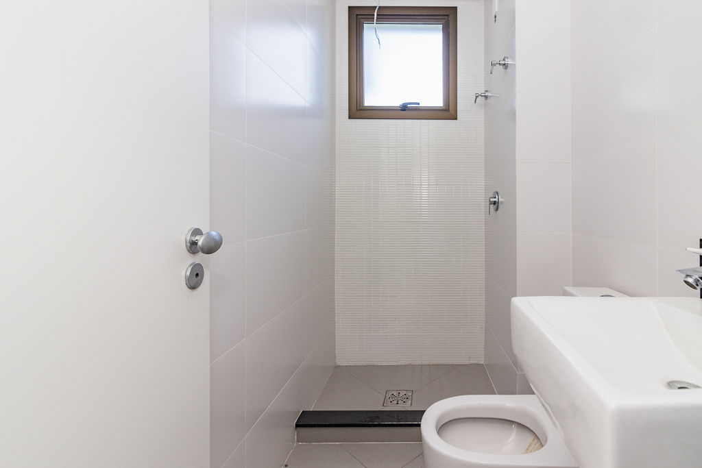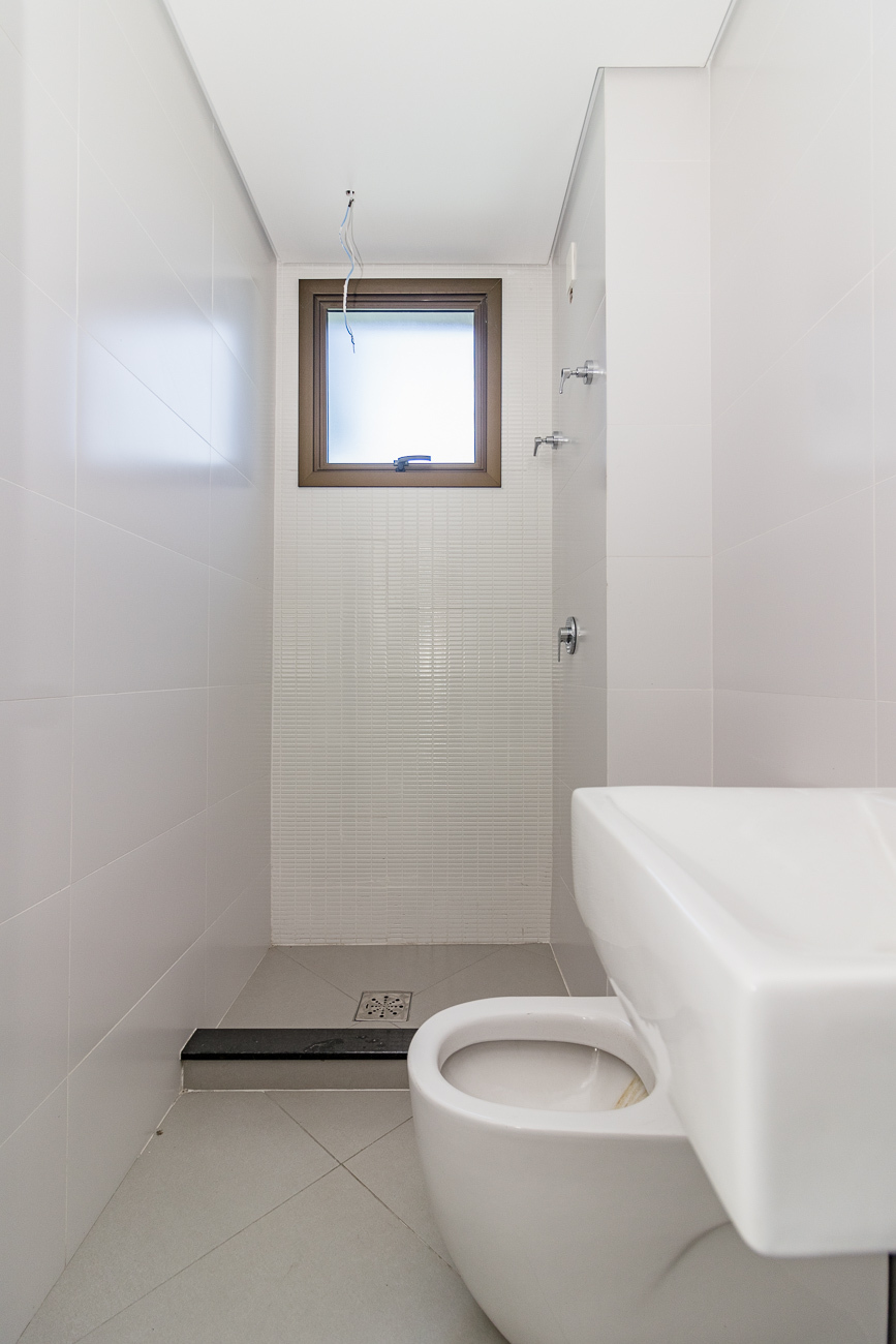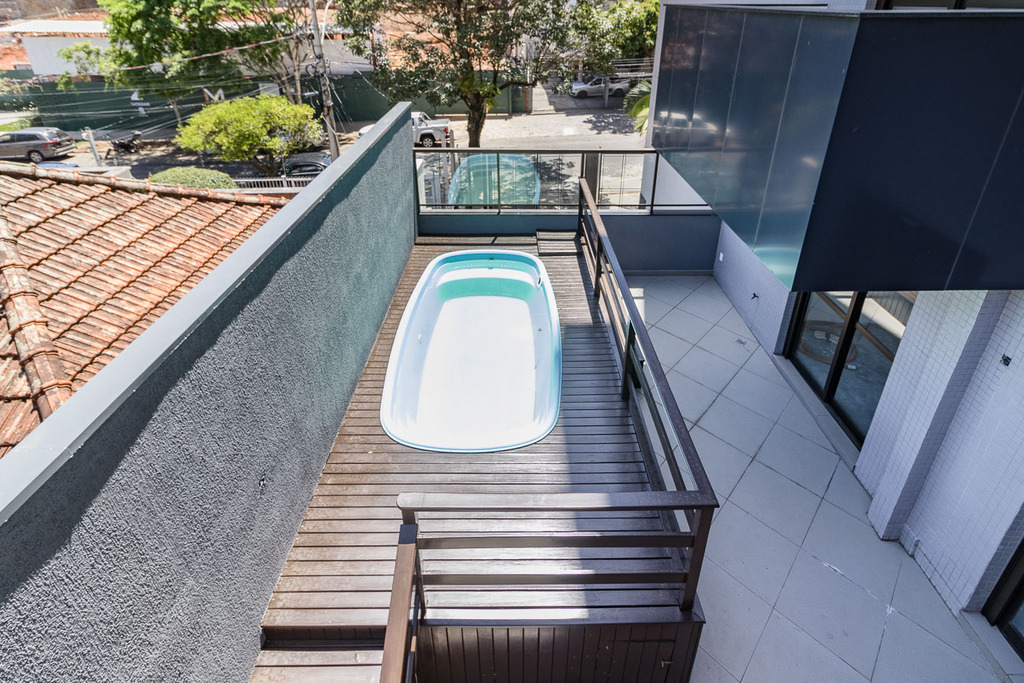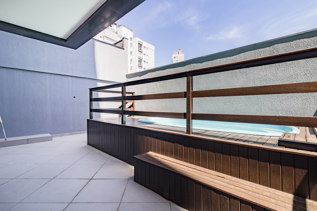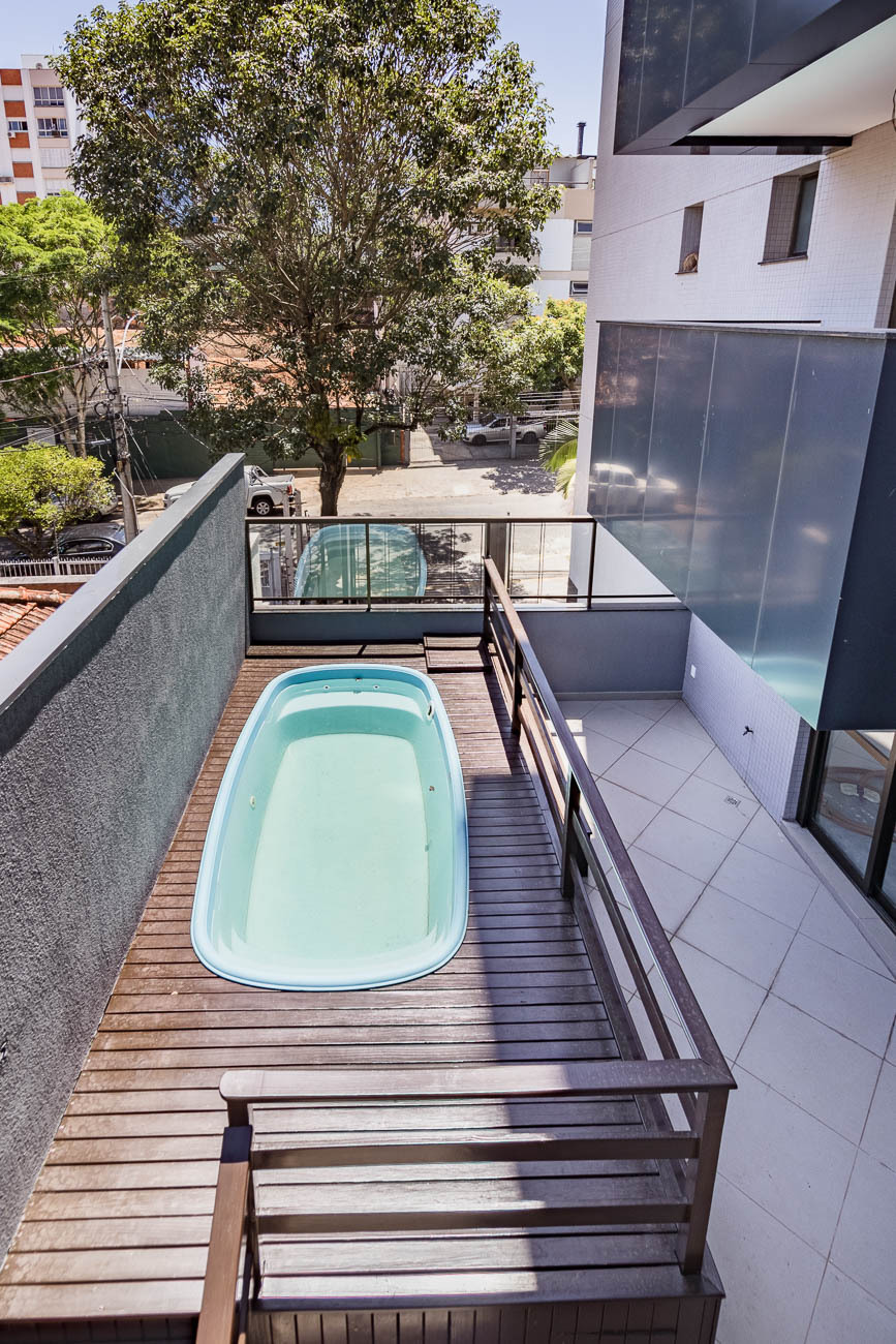 Apartamento de frente, muito ensolarado (leste e norte). Possui pátio lateral com deck e piscina já instalados.