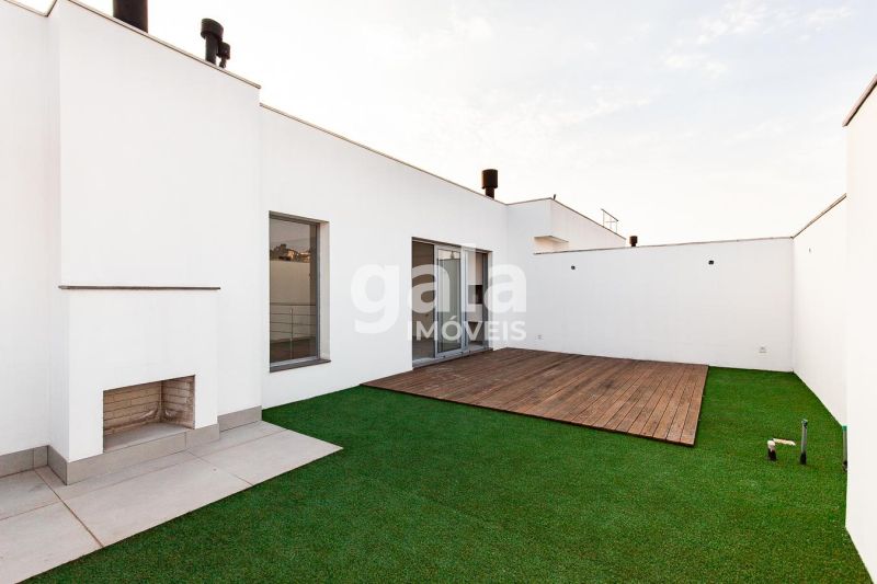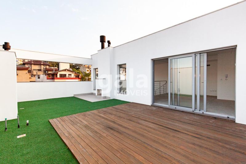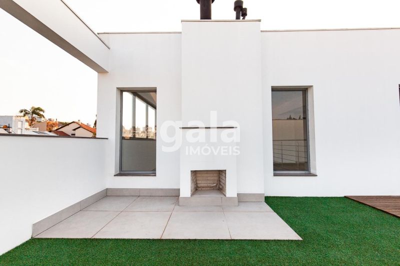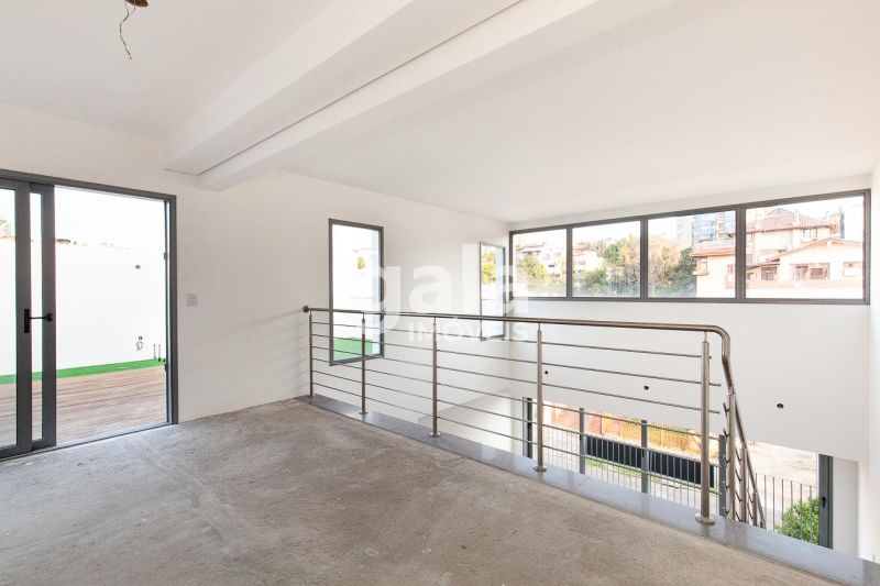 Andar superior com mezanino, lavabo, cozinha e terraço privativo com 48m².
