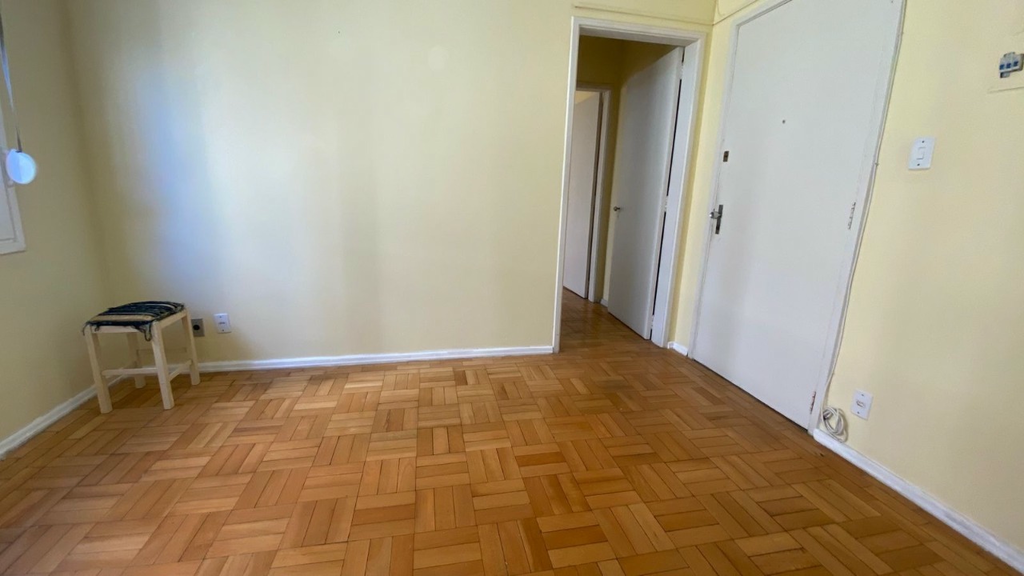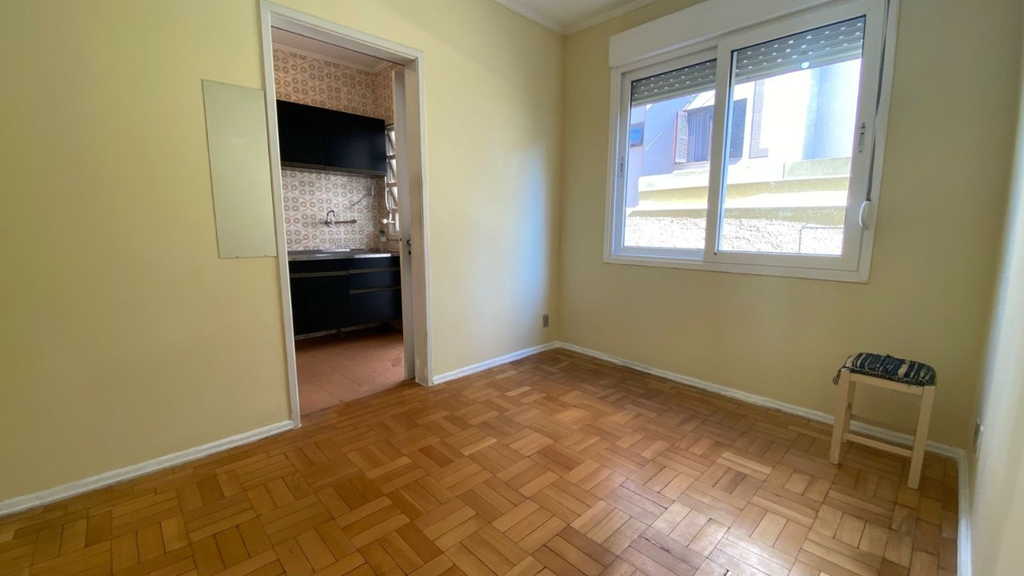 O imóvel desocupado possui 1 dormitório, living para 2 ambientes em parquet, aberturas novas, cozinha com área de serviço separada e banheiro social com ventilação natural.