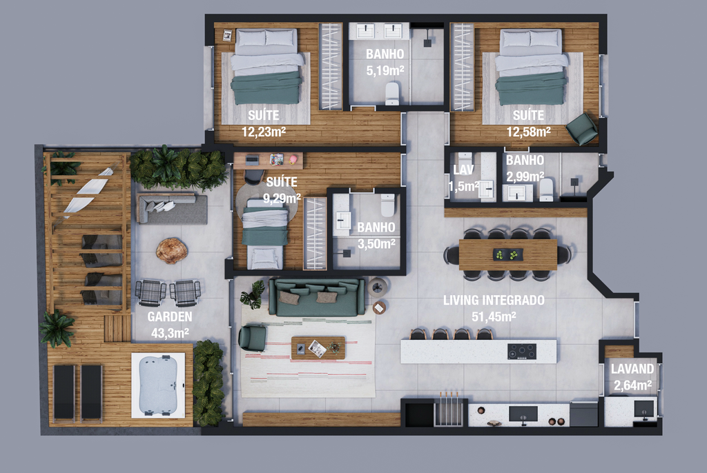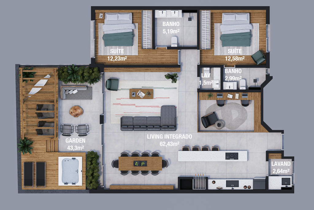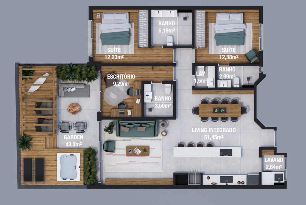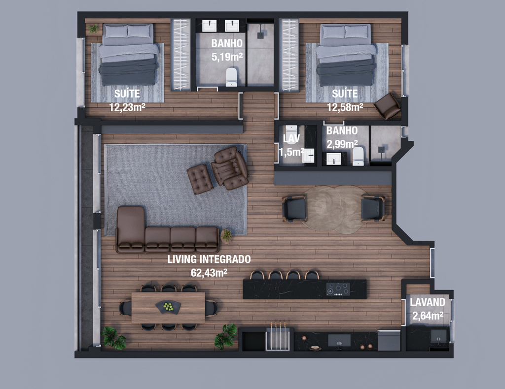 Desde o mobiliário assinado até a escolha dos materiais, o projeto alia o melhor em conforto, luxo e exclusividade.