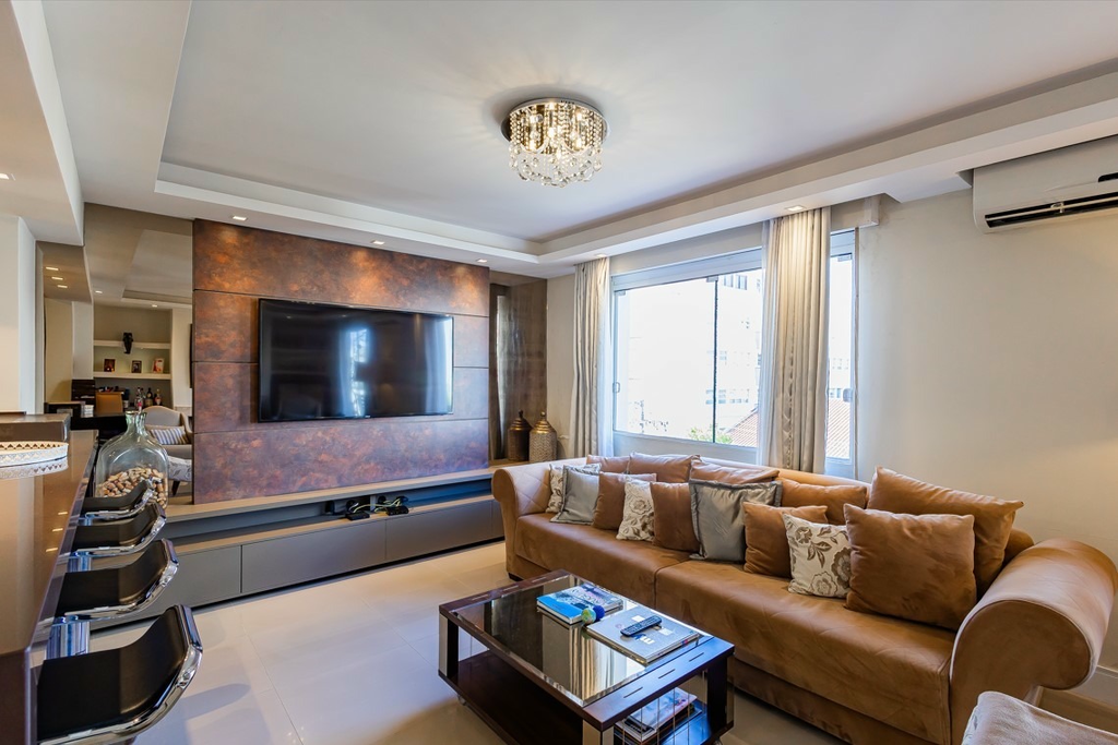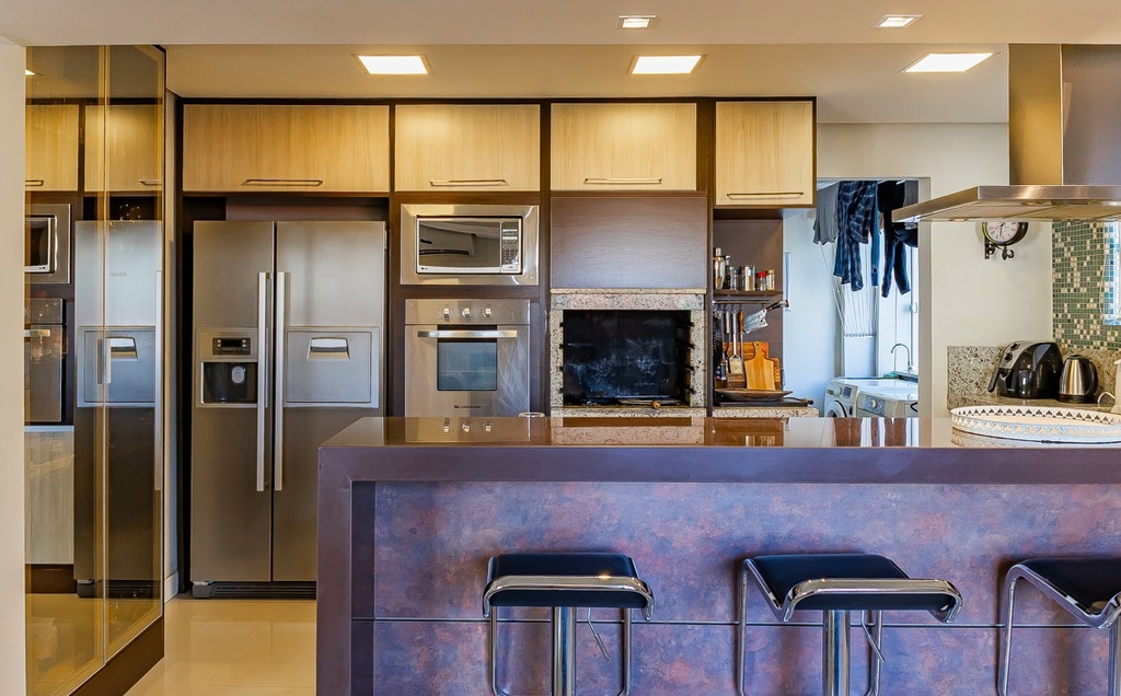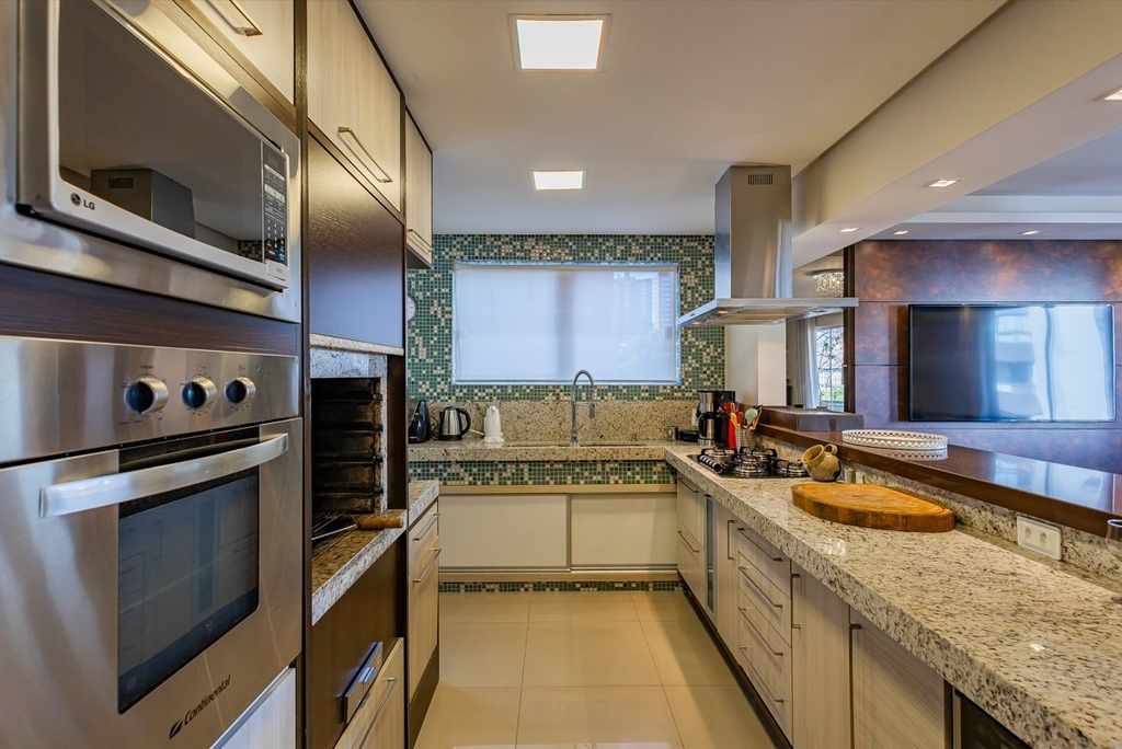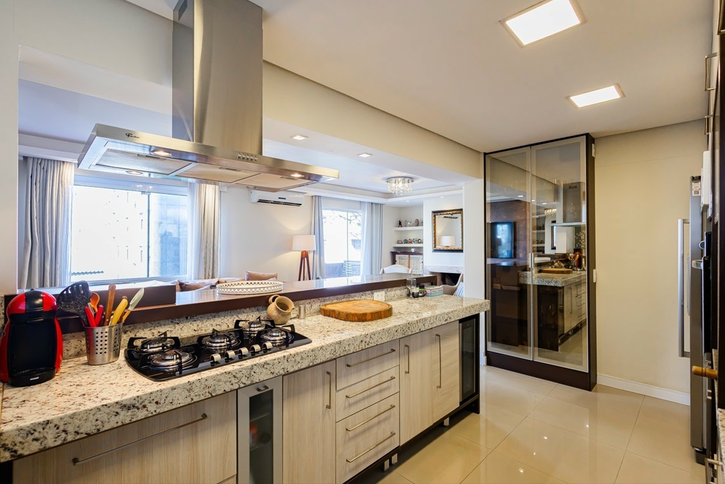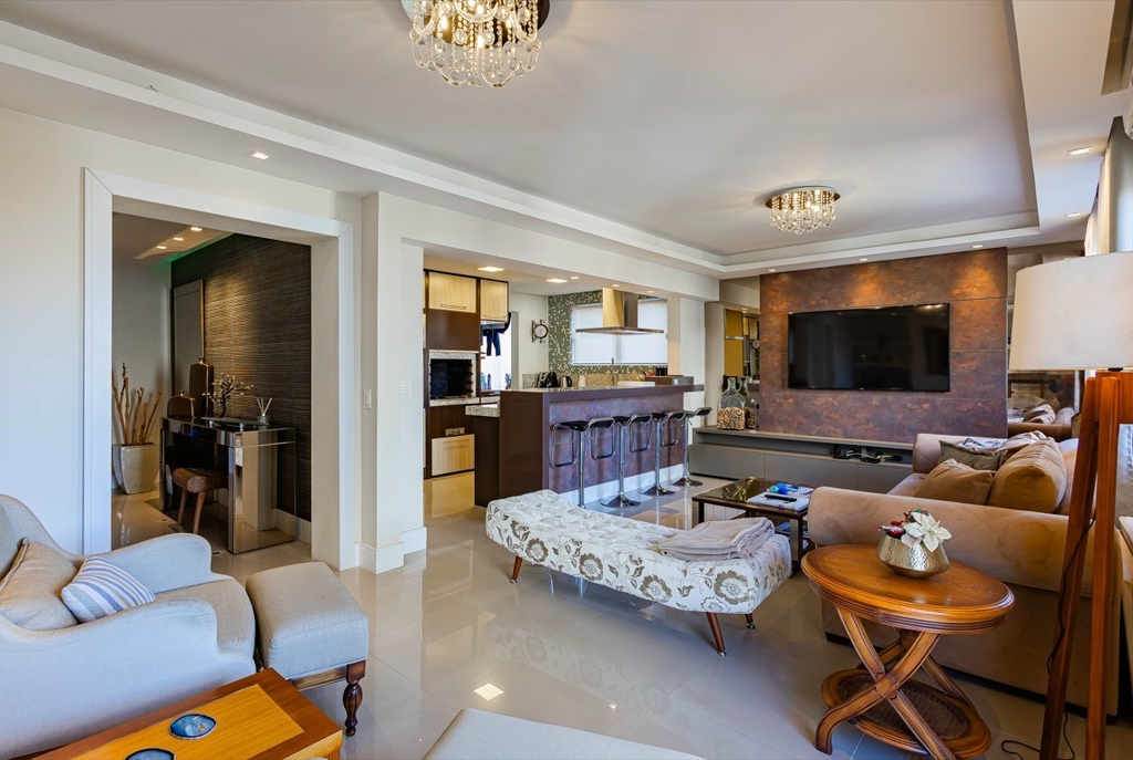 São 137m² de área privativa, 3 dormitórios sendo 02 suítes com closet, hall social com lavabo, amplo living 2 ambientes em porcelanato, com lareira, sacada, cozinha em ilha integrada, com churrasqueira.
