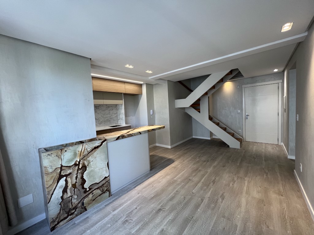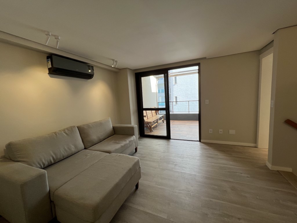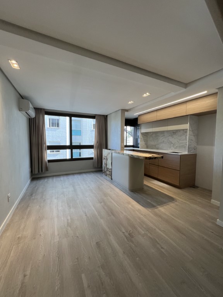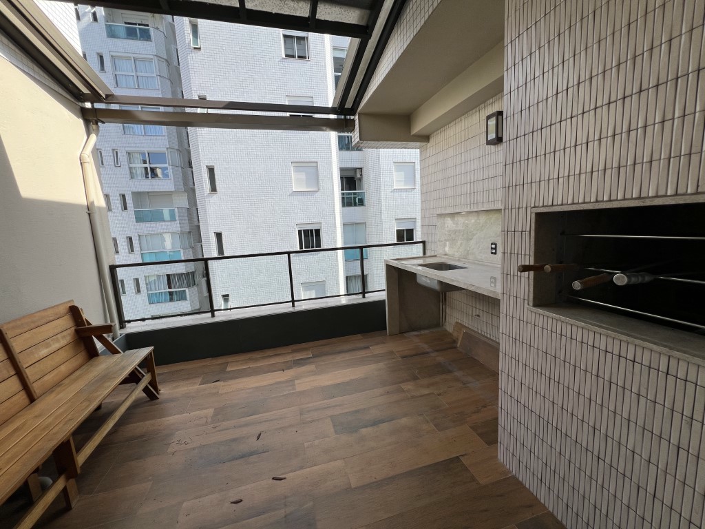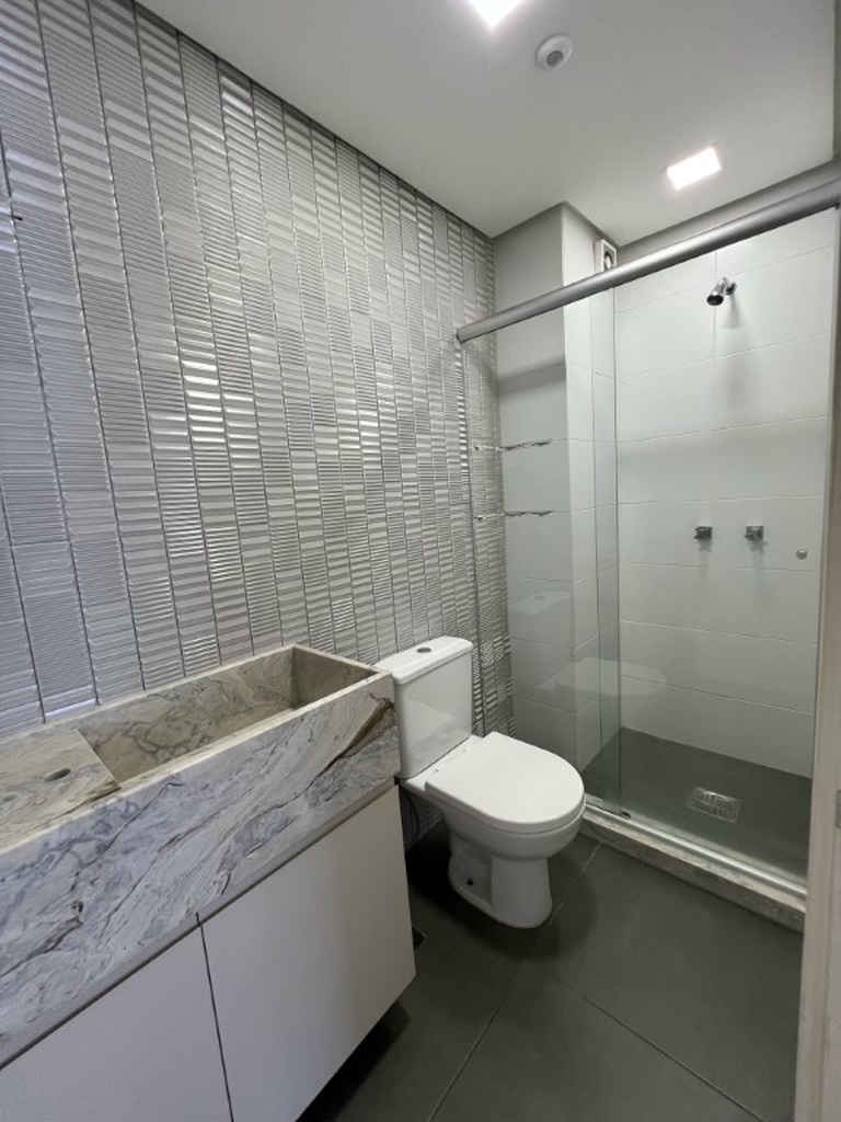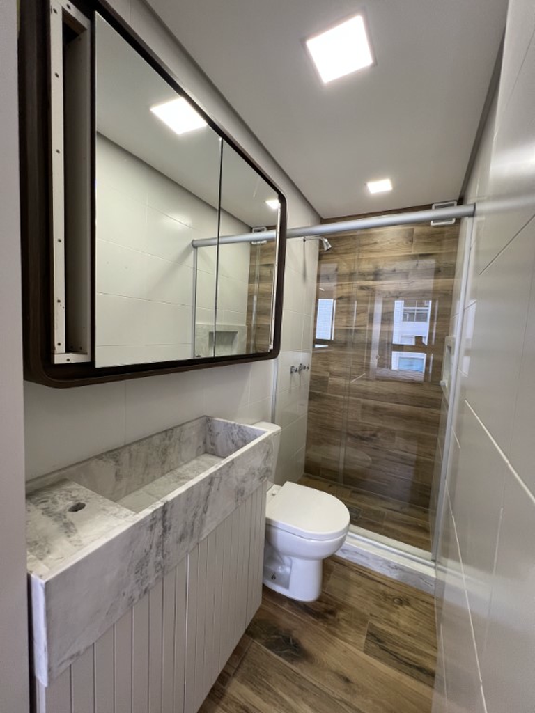 Apartamento de 65m² com 2 quartos, sendo 1 com sacada, 1 banheiro social, sala com sacada, cozinha, área de serviço e banheiro de serviço.