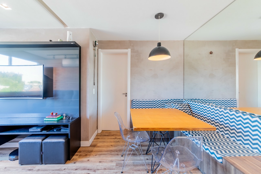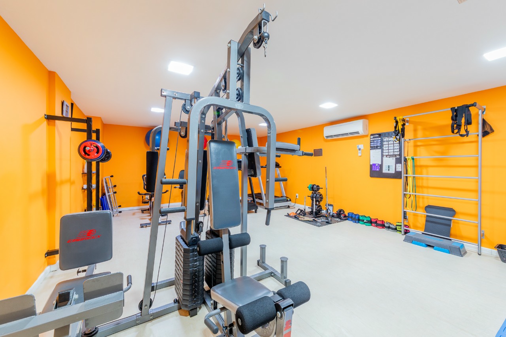 Possui sala para 2 ambientes, cozinha com área de serviço separada e churrasqueira a gás, 2 dormitórios sendo 1 suíte com armário e 1 quarto atualmente utilizado como escritório, além de split em todos os cômodos.