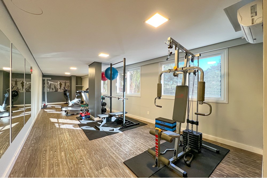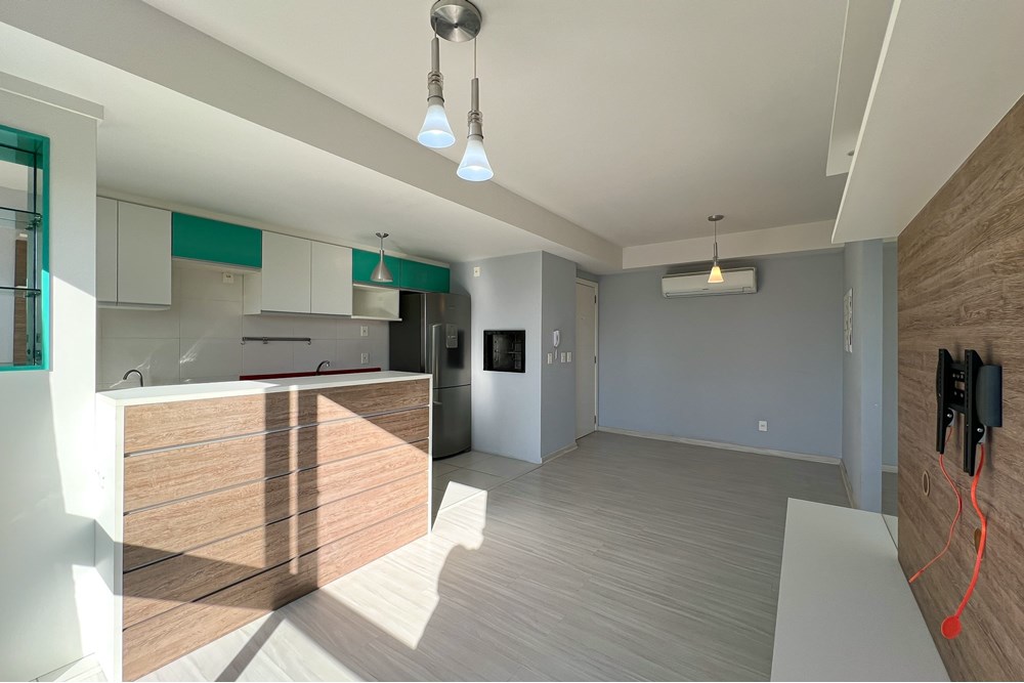 São 63 m² de área privativa muito bem distribuídos, com 2 dormitórios, sendo 1 suíte, living para dois ambientes, cozinha americana com churrasqueira integrada, banheiro social e área de serviço funcional e bem ventilada.