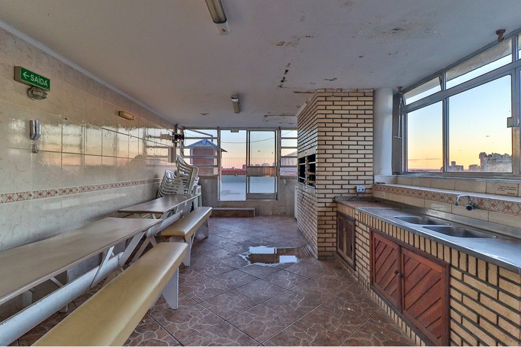 A cozinha, agora aberta, foi posicionada estrategicamente para promover fluidez entre os ambientes, com um balcão funcional e moderno que convida à convivência.