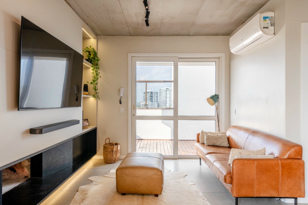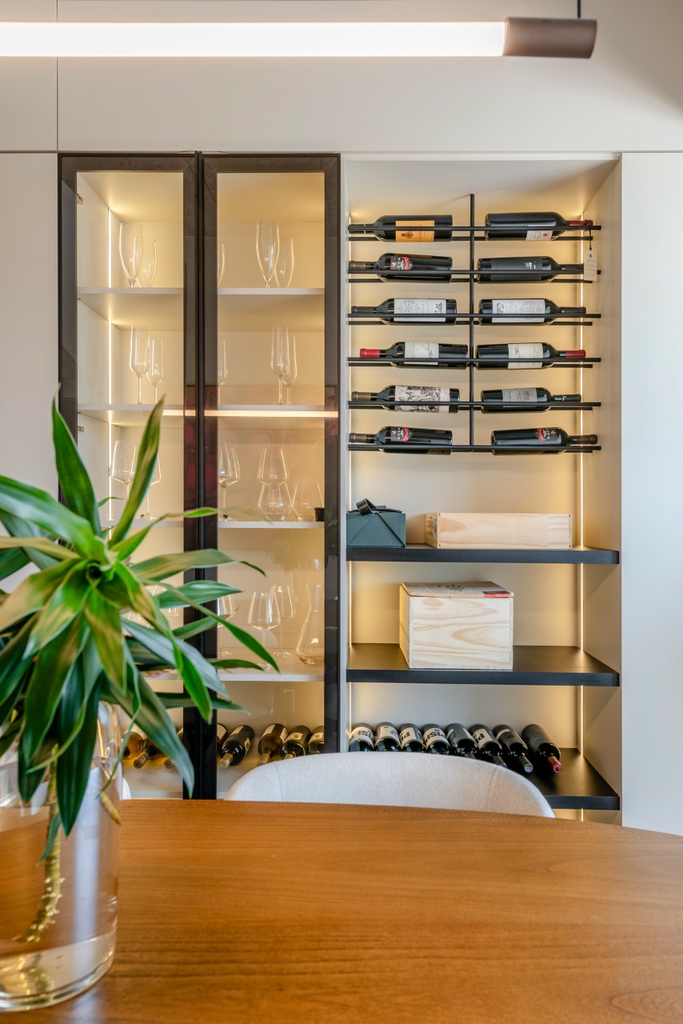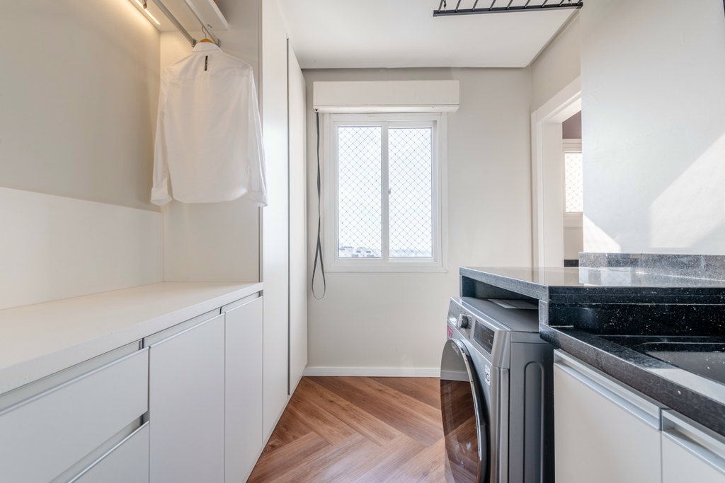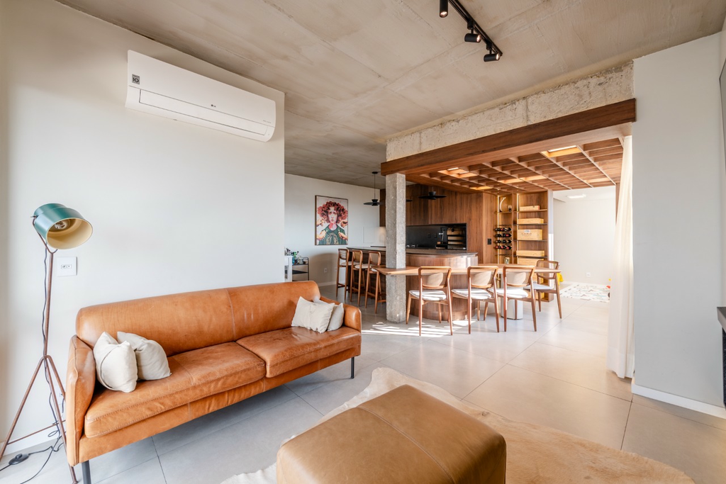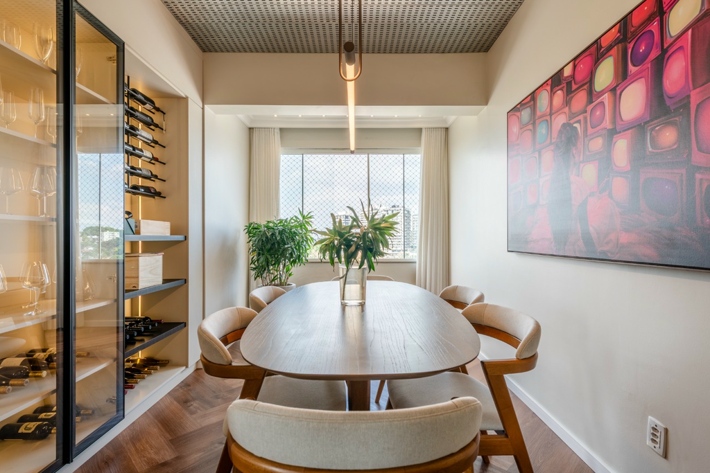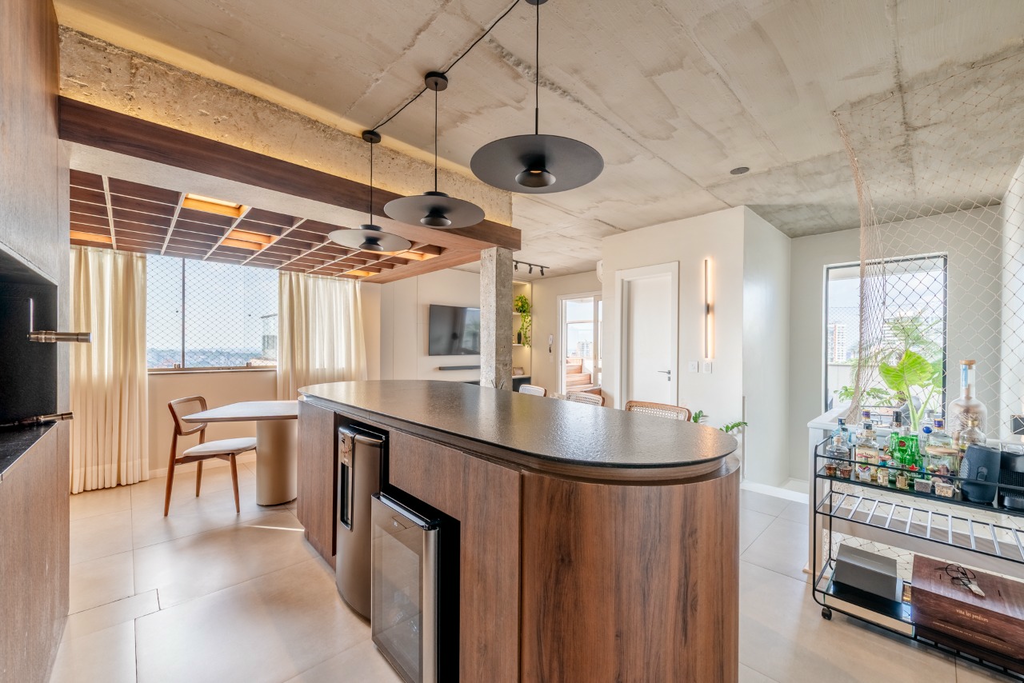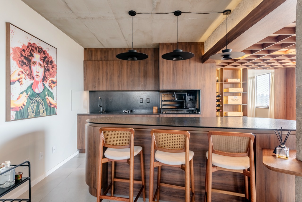 O living é um convite ao aconchego, com lareira ecológica e adega, emoldurado por detalhes de marcenaria em muxarabi que adicionam um toque artesanal e sofisticado. A cozinha é completa, e a área de serviço é espaçosa, com banheiro auxiliar.