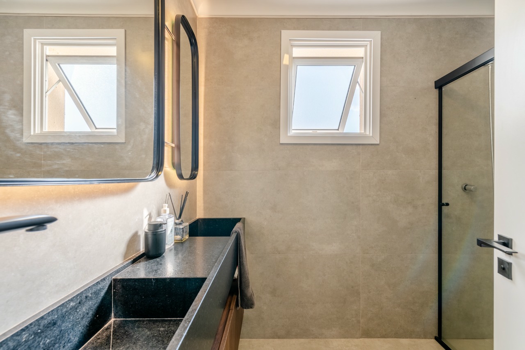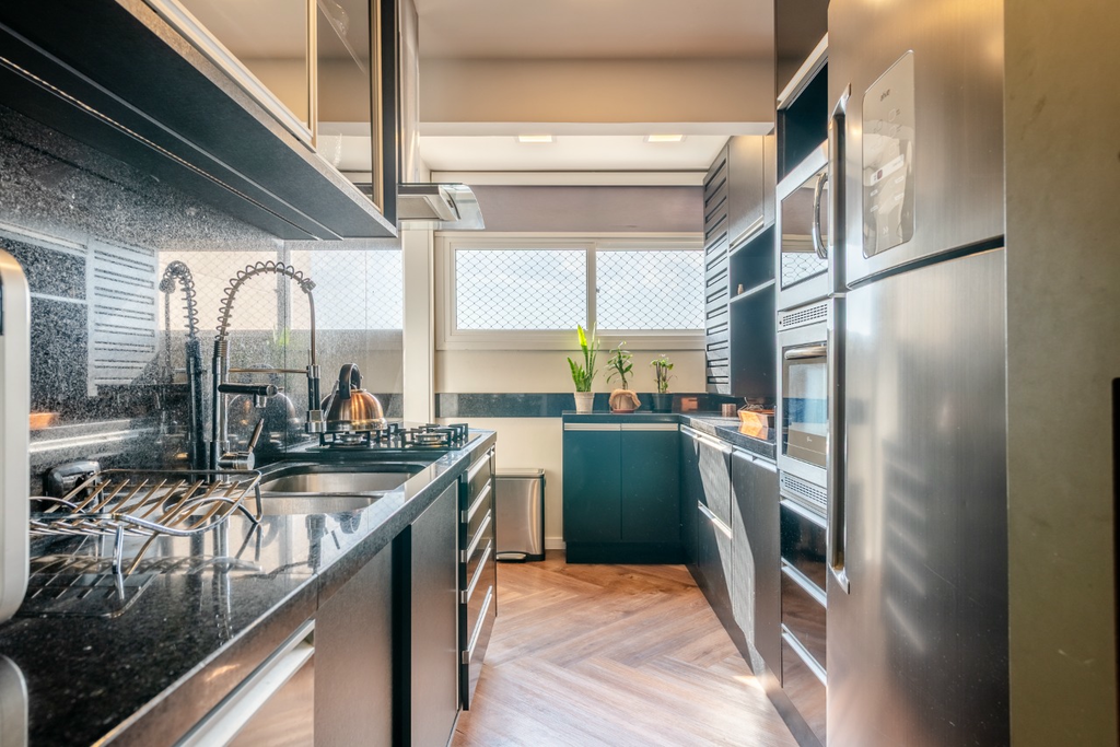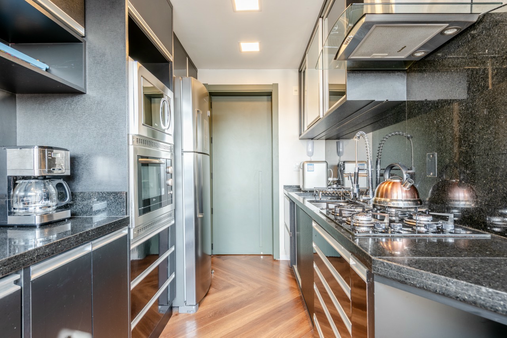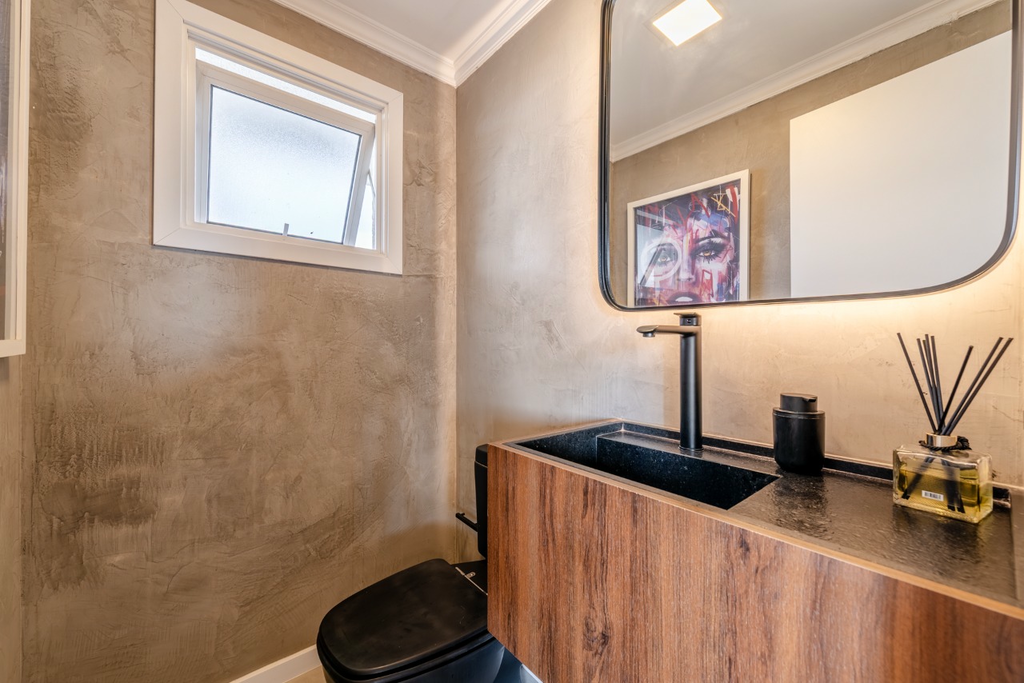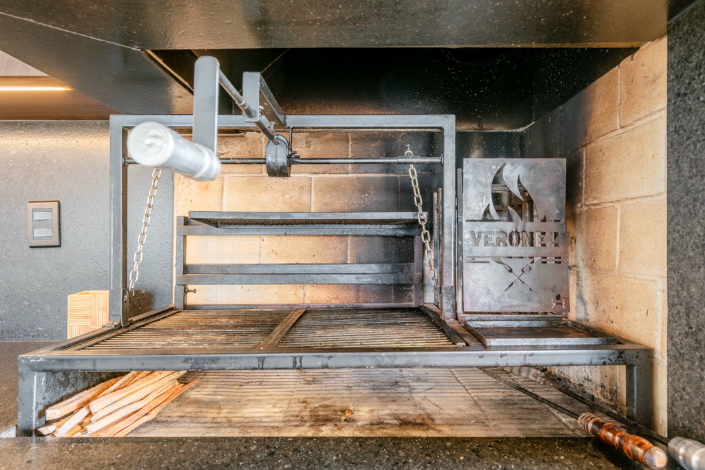 Na parte superior, o espaço gourmet é uma experiência à parte: conta com uma bancada de granito escovado, adega, parrilla, espaço kids, lavabo e uma área de televisão equipada com lareira a lenha.