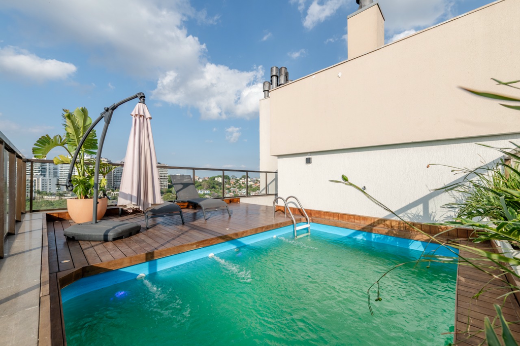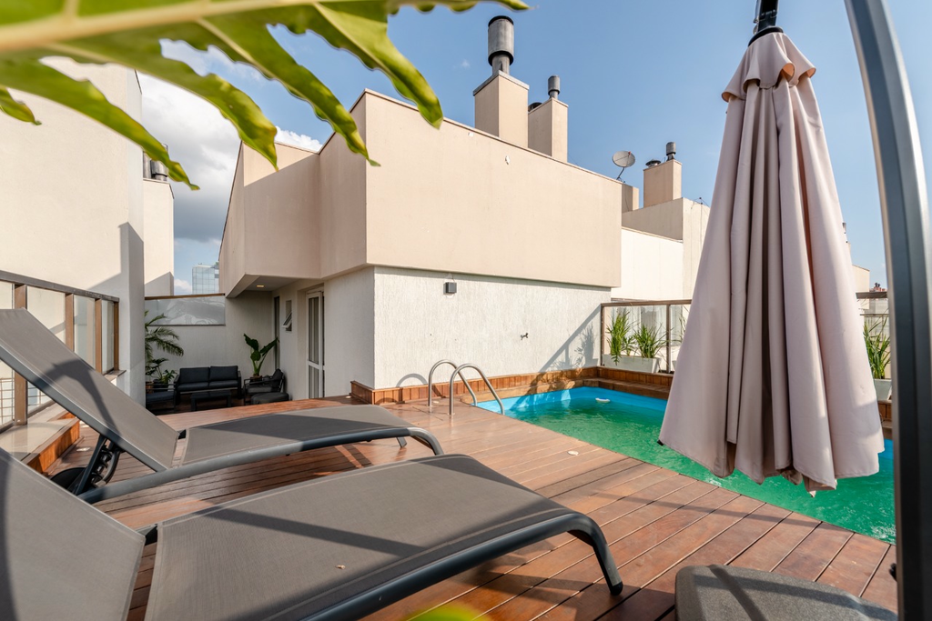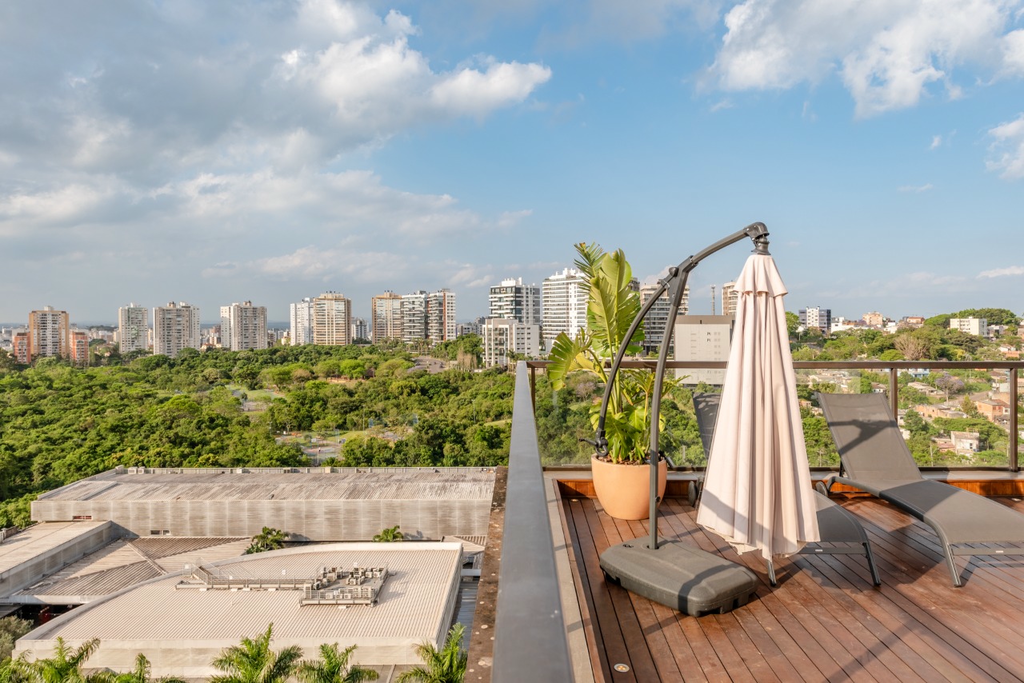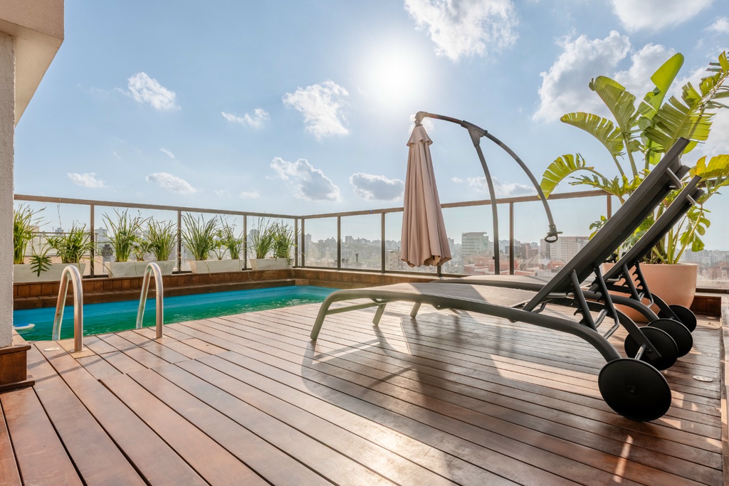 Ao ar livre, o deck integra uma área de convívio e piscina, que recebe sol o dia todo, com vistas de tirar o fôlego para o Jardim Europa.